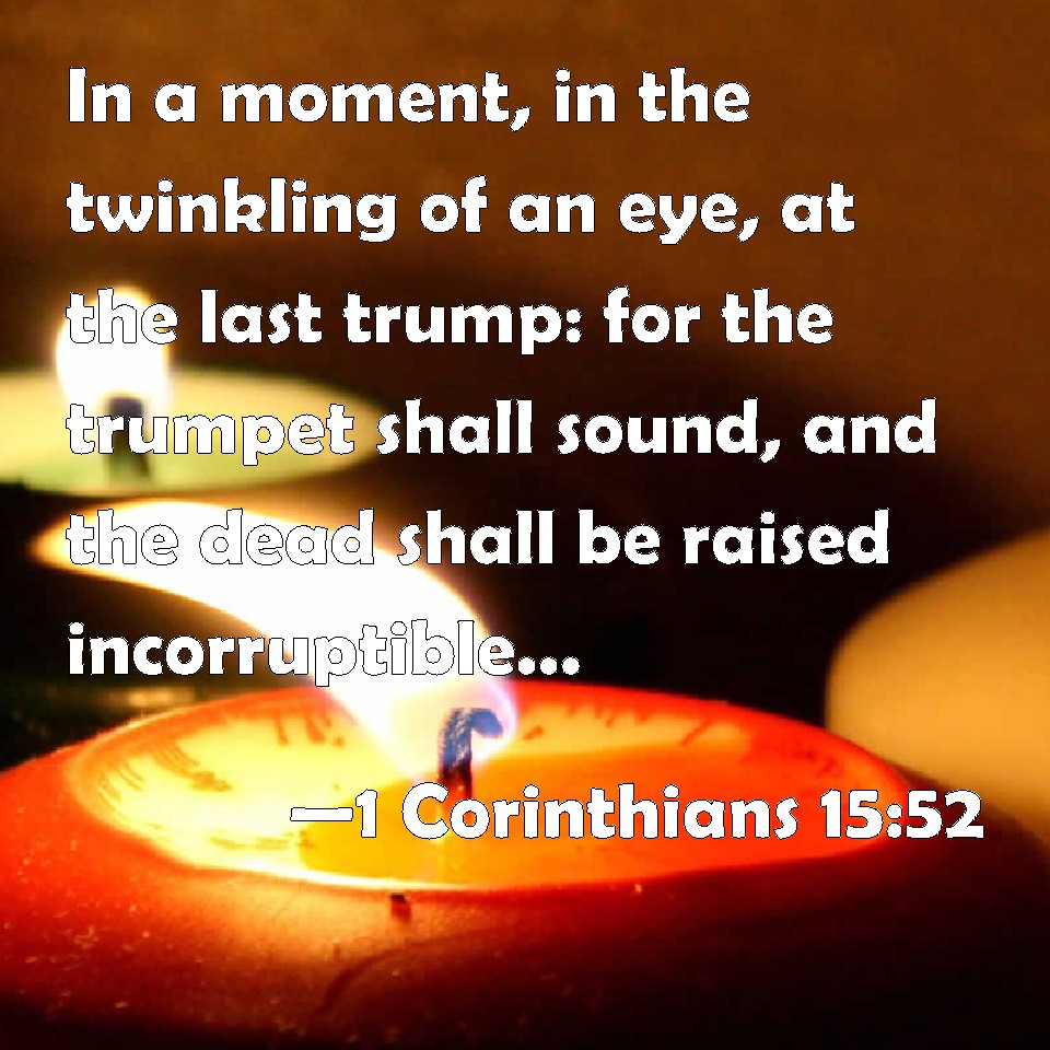 Choose a Background 1 Corinthians 15:52 In a moment, in the twinkling of an eye, at the last trump: for the trumpet shall sound, and the dead shall be raised incorruptible, and we shall be changed. KJV: In a moment, in the twinkling of an eye, at the last trump: for the trumpet shall sound, and the dead shall be raised incorruptible, and we shall be changed. DRB: In a moment, in the twinkling of an eye, at the last trumpet: for the trumpet shall sound, and the dead shall rise again incorruptible: and we shall be changed. DBT: in an instant, in the twinkling of an eye, at the last trumpet; for the trumpet shall sound, and the dead shall be raised incorruptible, and we shall be changed. ERV: in a moment, in the twinkling of an eye, at the last trump: for the trumpet shall sound, and the dead shall be raised incorruptible, and we shall be changed. WBT: In a moment, in the twinkling of an eye, at the last trumpet; for the trumpet shall sound, and the dead shall be raised incorruptible, and we shall be changed. WEB: in a moment, in the twinkling of an eye, at the last trumpet. For the trumpet will sound, and the dead will be raised incorruptible, and we will be changed. YLT: in a moment, in the twinkling of an eye, in the last trumpet, for it shall sound, and the dead shall be raised incorruptible, and we — we shall be changed:Links 1 Corinthians 15:52 NIV • 1 Corinthians 15:52 NLT • 1 Corinthians 15:52 ESV • 1 Corinthians 15:52 NASB • 1 Corinthians 15:52 KJV • 1 Corinthians 15:52 Interlinear • 1 Corinthians 15:52 Commentaries • 1 Corinthians 15:52 Parallel Texts • 1 Corinthians 15:52 Bible Apps • 1 Corinthians 15:52 Parallel • Bible Hub |