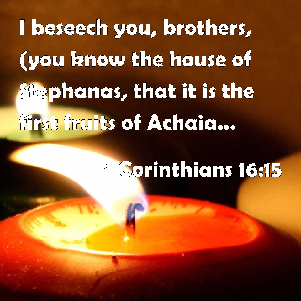 Choose a Background 1 Corinthians 16:15 I beseech you, brothers, (you know the house of Stephanas, that it is the first fruits of Achaia, and that they have addicted themselves to the ministry of the saints,) KJV: I beseech you, brethren, (ye know the house of Stephanas, that it is the firstfruits of Achaia, and that they have addicted themselves to the ministry of the saints,) DRB: And I beseech you, brethren, you know the house of Stephanas, and of Fortunatus, and of Achaicus, that they are the firstfruits of Achaia, and have dedicated themselves to the ministry of the saints: DBT: But I beseech you, brethren, (ye know the house of Stephanas, that it is the first-fruits of Achaia, and they have devoted themselves to the saints for service,) ERV: Now I beseech you, brethren (ye know the house of Stephanas, that it is the firstfruits of Achaia, and that they have set themselves to minister unto the saints), WBT: I beseech you, brethren, (ye know the house of Stephanas, that it is the first fruits of Achaia, and that they have addicted themselves to the ministry of the saints,) WEB: Now I beg you, brothers (you know the house of Stephanas, that it is the first fruits of Achaia, and that they have set themselves to serve the saints), YLT: And I entreat you, brethren, ye have known the household of Stephanas, that it is the first-fruit of Achaia, and to the ministration to the saints they did set themselves — Links 1 Corinthians 16:15 NIV • 1 Corinthians 16:15 NLT • 1 Corinthians 16:15 ESV • 1 Corinthians 16:15 NASB • 1 Corinthians 16:15 KJV • 1 Corinthians 16:15 Interlinear • 1 Corinthians 16:15 Commentaries • 1 Corinthians 16:15 Parallel Texts • 1 Corinthians 16:15 Bible Apps • 1 Corinthians 16:15 Parallel • Bible Hub |