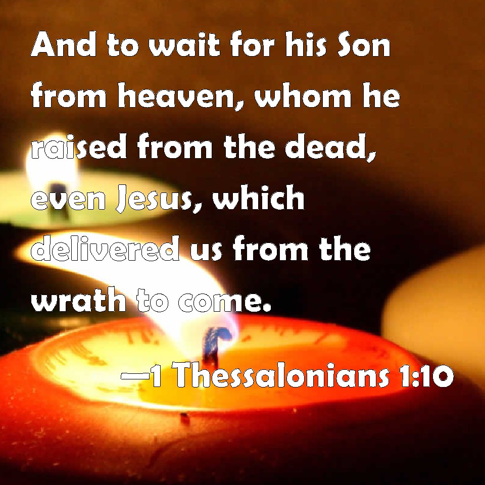 Choose a Background 1 Thessalonians 1:10 And to wait for his Son from heaven, whom he raised from the dead, even Jesus, which delivered us from the wrath to come. KJV: And to wait for his Son from heaven, whom he raised from the dead, even Jesus, which delivered us from the wrath to come. DRB: And to wait for his Son from heaven (whom he raised up from the dead,) Jesus, who hath delivered us from the wrath to come. DBT: and to await his Son from the heavens, whom he raised from among the dead, Jesus, our deliverer from the coming wrath. ERV: and to wait for his Son from heaven, whom he raised from the dead, even Jesus, which delivereth us from the wrath to come. WBT: And to wait for his Son from heaven, whom he raised from the dead, even Jesus, who delivered us from the wrath to come. WEB: and to wait for his Son from heaven, whom he raised from the dead—Jesus, who delivers us from the wrath to come. YLT: and to wait for His Son from the heavens, whom He did raise out of the dead — Jesus, who is rescuing us from the anger that is coming.Links 1 Thessalonians 1:10 NIV • 1 Thessalonians 1:10 NLT • 1 Thessalonians 1:10 ESV • 1 Thessalonians 1:10 NASB • 1 Thessalonians 1:10 KJV • 1 Thessalonians 1:10 Interlinear • 1 Thessalonians 1:10 Commentaries • 1 Thessalonians 1:10 Parallel Texts • 1 Thessalonians 1:10 Bible Apps • 1 Thessalonians 1:10 Parallel • Bible Hub |