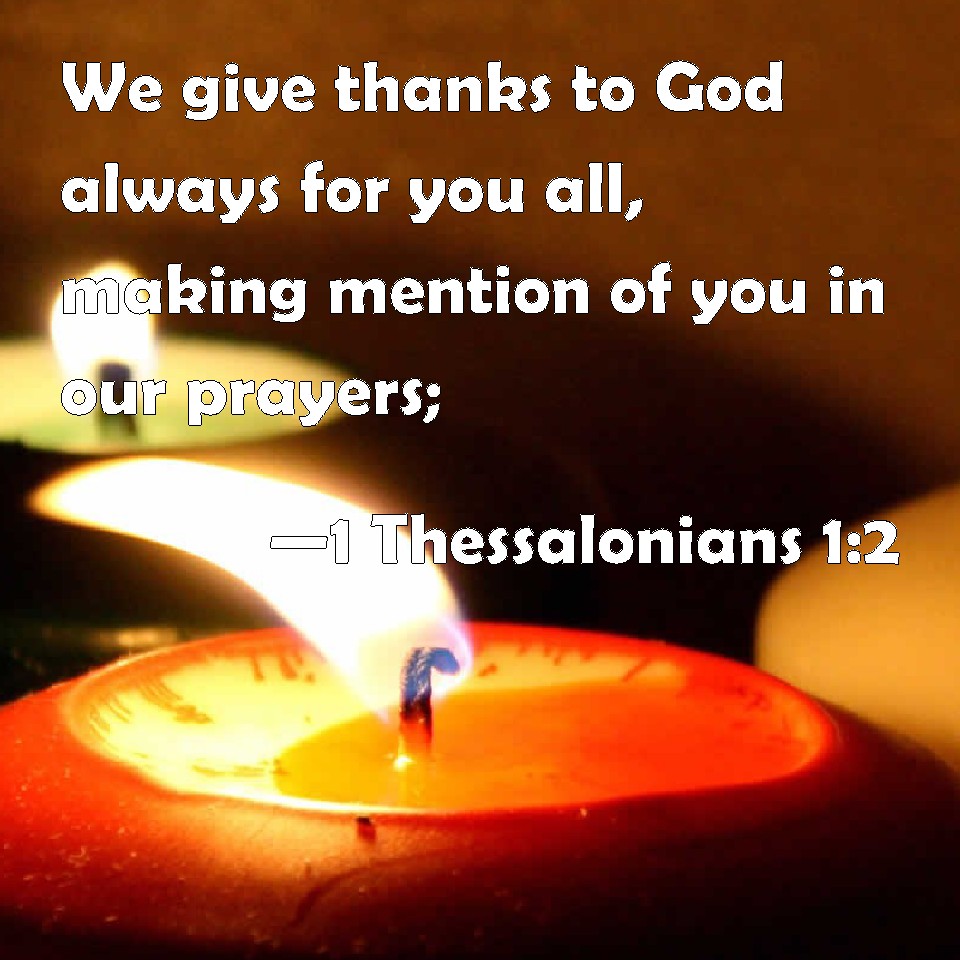 Choose a Background 1 Thessalonians 1:2 We give thanks to God always for you all, making mention of you in our prayers; KJV: We give thanks to God always for you all, making mention of you in our prayers; DRB: Grace be to you and peace. We give thanks to God always for you all; making a remembrance of you in our prayers without ceasing, DBT: We give thanks to God always for you all, making mention of you at our prayers, ERV: We give thanks to God always for you all, making mention of you in our prayers; WBT: We give thanks to God always for you all, making mention of you in our prayers; WEB: We always give thanks to God for all of you, mentioning you in our prayers, YLT: We give thanks to God always for you all, making mention of you in our prayers,Links 1 Thessalonians 1:2 NIV • 1 Thessalonians 1:2 NLT • 1 Thessalonians 1:2 ESV • 1 Thessalonians 1:2 NASB • 1 Thessalonians 1:2 KJV • 1 Thessalonians 1:2 Interlinear • 1 Thessalonians 1:2 Commentaries • 1 Thessalonians 1:2 Parallel Texts • 1 Thessalonians 1:2 Bible Apps • 1 Thessalonians 1:2 Parallel • Bible Hub |