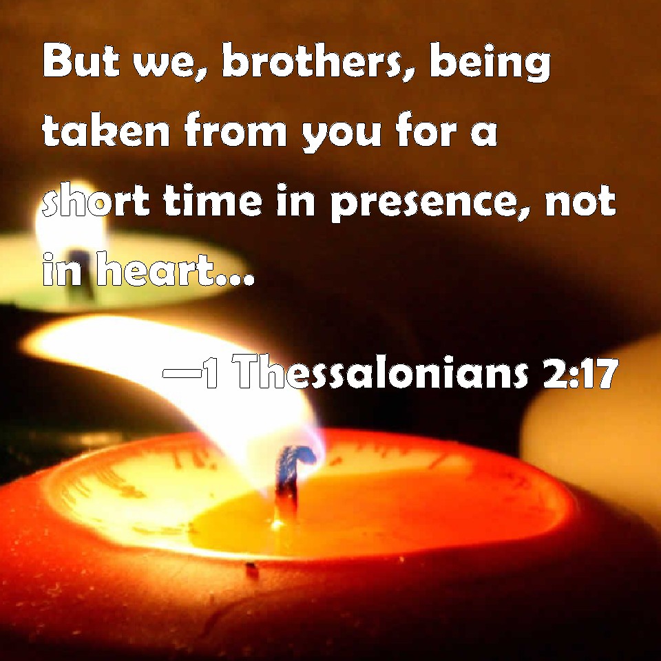 Choose a Background 1 Thessalonians 2:17 But we, brothers, being taken from you for a short time in presence, not in heart, endeavored the more abundantly to see your face with great desire. KJV: But we, brethren, being taken from you for a short time in presence, not in heart, endeavoured the more abundantly to see your face with great desire. DRB: But we, brethren, being taken away from you for a short time, in sight, not in heart, have hastened the more abundantly to see your face with great desire. DBT: But we, brethren, having been bereaved of you and separated for a little moment in person, not in heart, have used more abundant diligence to see your face with much desire; ERV: But we, brethren, being bereaved of you for a short season, in presence, not in heart, endeavoured the more exceedingly to see your face with great desire: WBT: But we, brethren, being taken from you for a short time in presence, not in heart, endeavored the more abundantly to see your face with great desire. WEB: But we, brothers, being bereaved of you for a short season, in presence, not in heart, tried even harder to see your face with great desire, YLT: And we, brethren, having been taken from you for the space of an hour — in presence, not in heart — did hasten the more abundantly to see your face in much desire,Links 1 Thessalonians 2:17 NIV • 1 Thessalonians 2:17 NLT • 1 Thessalonians 2:17 ESV • 1 Thessalonians 2:17 NASB • 1 Thessalonians 2:17 KJV • 1 Thessalonians 2:17 Interlinear • 1 Thessalonians 2:17 Commentaries • 1 Thessalonians 2:17 Parallel Texts • 1 Thessalonians 2:17 Bible Apps • 1 Thessalonians 2:17 Parallel • Bible Hub |
