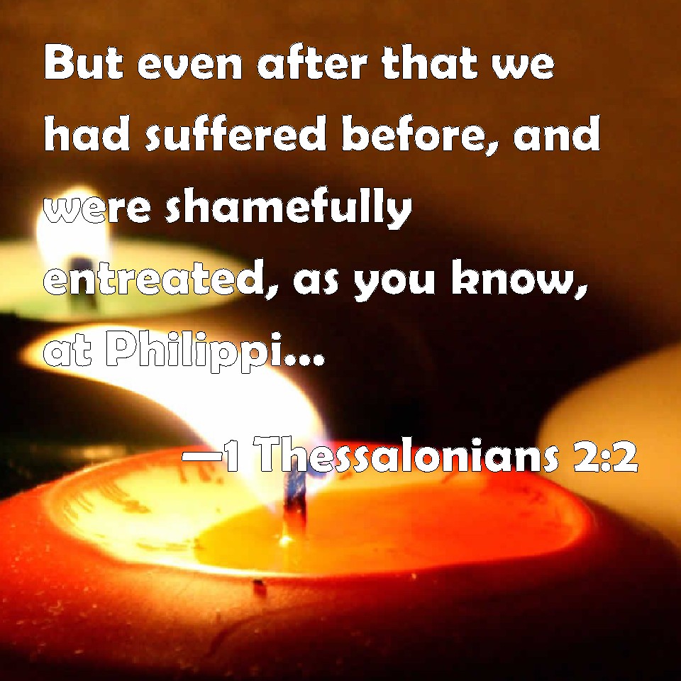 Choose a Background 1 Thessalonians 2:2 But even after that we had suffered before, and were shamefully entreated, as you know, at Philippi, we were bold in our God to speak to you the gospel of God with much contention. KJV: But even after that we had suffered before, and were shamefully entreated, as ye know, at Philippi, we were bold in our God to speak unto you the gospel of God with much contention. DRB: But having suffered many things before, and been shamefully treated (as you know) at Philippi, we had confidence in our God, to speak unto you the gospel of God in much carefulness. DBT: but, having suffered before and been insulted, even as ye know, in Philippi, we were bold in our God to speak unto you the glad tidings of God with much earnest striving. ERV: but having suffered before, and been shamefully entreated, as ye know, at Philippi, we waxed bold in our God to speak unto you the gospel of God in much conflict. WBT: But even after we had suffered before, and were shamefully treated, as ye know, at Phillippi, we were bold in our God to speak to you the gospel of God with much contention. WEB: but having suffered before and been shamefully treated, as you know, at Philippi, we grew bold in our God to tell you the Good News of God in much conflict. YLT: but having both suffered before, and having been injuriously treated (as ye have known) in Philippi, we were bold in our God to speak unto you the good news of God in much conflict,Links 1 Thessalonians 2:2 NIV • 1 Thessalonians 2:2 NLT • 1 Thessalonians 2:2 ESV • 1 Thessalonians 2:2 NASB • 1 Thessalonians 2:2 KJV • 1 Thessalonians 2:2 Interlinear • 1 Thessalonians 2:2 Commentaries • 1 Thessalonians 2:2 Parallel Texts • 1 Thessalonians 2:2 Bible Apps • 1 Thessalonians 2:2 Parallel • Bible Hub |