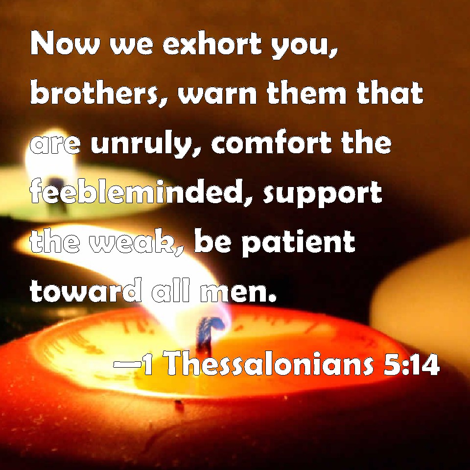 Choose a Background 1 Thessalonians 5:14 Now we exhort you, brothers, warn them that are unruly, comfort the feebleminded, support the weak, be patient toward all men. KJV: Now we exhort you, brethren, warn them that are unruly, comfort the feebleminded, support the weak, be patient toward all men. DRB: And we beseech you, brethren, rebuke the unquiet, comfort the feeble minded, support the weak, be patient towards all men. DBT: But we exhort you, brethren, admonish the disorderly, comfort the faint-hearted, sustain the weak, be patient towards all. ERV: And we exhort you, brethren, admonish the disorderly, encourage the fainthearted, support the weak, be longsuffering toward all. WBT: Now we exhort you, brethren, warn them that are disorderly, comfort the feeble-minded, support the weak, be patient towards all men. WEB: We exhort you, brothers, admonish the disorderly, encourage the fainthearted, support the weak, be patient toward all. YLT: and we exhort you, brethren, admonish the disorderly, comfort the feeble-minded, support the infirm, be patient unto all;Links 1 Thessalonians 5:14 NIV • 1 Thessalonians 5:14 NLT • 1 Thessalonians 5:14 ESV • 1 Thessalonians 5:14 NASB • 1 Thessalonians 5:14 KJV • 1 Thessalonians 5:14 Interlinear • 1 Thessalonians 5:14 Commentaries • 1 Thessalonians 5:14 Parallel Texts • 1 Thessalonians 5:14 Bible Apps • 1 Thessalonians 5:14 Parallel • Bible Hub |