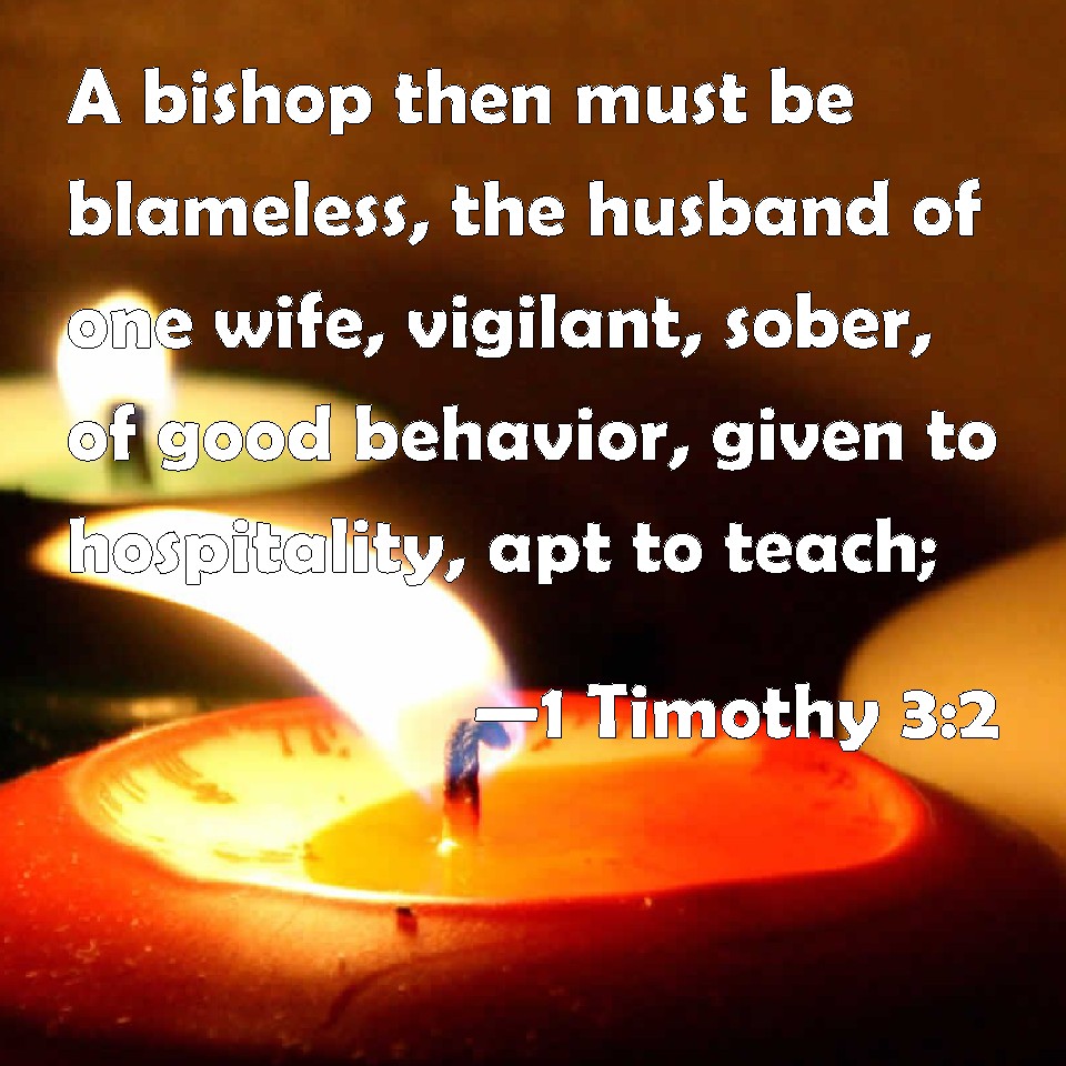 Choose a Background 1 Timothy 3:2 A bishop then must be blameless, the husband of one wife, vigilant, sober, of good behavior, given to hospitality, apt to teach; KJV: A bishop then must be blameless, the husband of one wife, vigilant, sober, of good behaviour, given to hospitality, apt to teach; DRB: It behoveth therefore a bishop to be blameless, the husband of one wife, sober, prudent, of good behaviour, chaste, given to hospitality, a teacher, DBT: The overseer then must be irreproachable, husband of one wife, sober, discreet, decorous, hospitable, apt to teach; ERV: The bishop therefore must be without reproach, the husband of one wife, temperate, soberminded, orderly, given to hospitality, apt to teach; WBT: A bishop then must be blameless, the husband of one wife, vigilant, sober, of good behavior, given to hospitality, apt to teach; WEB: The overseer therefore must be without reproach, the husband of one wife, temperate, sensible, modest, hospitable, good at teaching; YLT: it behoveth, therefore, the overseer to be blameless, of one wife a husband, vigilant, sober, decent, a friend of strangers, apt to teach,Links 1 Timothy 3:2 NIV • 1 Timothy 3:2 NLT • 1 Timothy 3:2 ESV • 1 Timothy 3:2 NASB • 1 Timothy 3:2 KJV • 1 Timothy 3:2 Interlinear • 1 Timothy 3:2 Commentaries • 1 Timothy 3:2 Parallel Texts • 1 Timothy 3:2 Bible Apps • 1 Timothy 3:2 Parallel • Bible Hub |