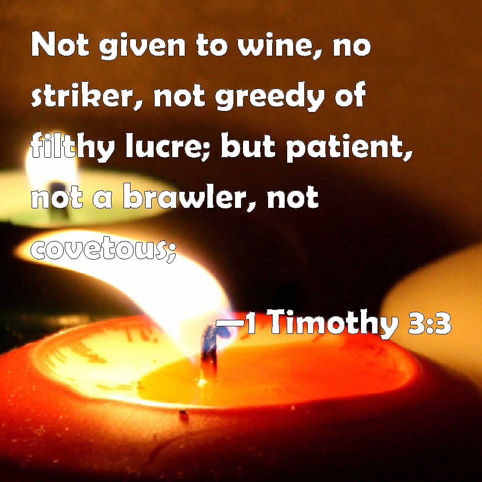 Choose a Background 1 Timothy 3:3 Not given to wine, no striker, not greedy of filthy lucre; but patient, not a brawler, not covetous; KJV: Not given to wine, no striker, not greedy of filthy lucre; but patient, not a brawler, not covetous; DRB: Not given to wine, no striker, but modest, not quarrelsome, not covetous, but DBT: not given to excesses from wine, not a striker, but mild, not addicted to contention, not fond of money, ERV: no brawler, no striker; but gentle, not contentious, no lover of money; WBT: Not given to wine, no striker, not greedy of filthy lucre, but patient; not a brawler, not covetous; WEB: not a drinker, not violent, not greedy for money, but gentle, not quarrelsome, not covetous; YLT: not given to wine, not a striker, not given to filthy lucre, but gentle, not contentious, not a lover of money,Links 1 Timothy 3:3 NIV • 1 Timothy 3:3 NLT • 1 Timothy 3:3 ESV • 1 Timothy 3:3 NASB • 1 Timothy 3:3 KJV • 1 Timothy 3:3 Interlinear • 1 Timothy 3:3 Commentaries • 1 Timothy 3:3 Parallel Texts • 1 Timothy 3:3 Bible Apps • 1 Timothy 3:3 Parallel • Bible Hub |
