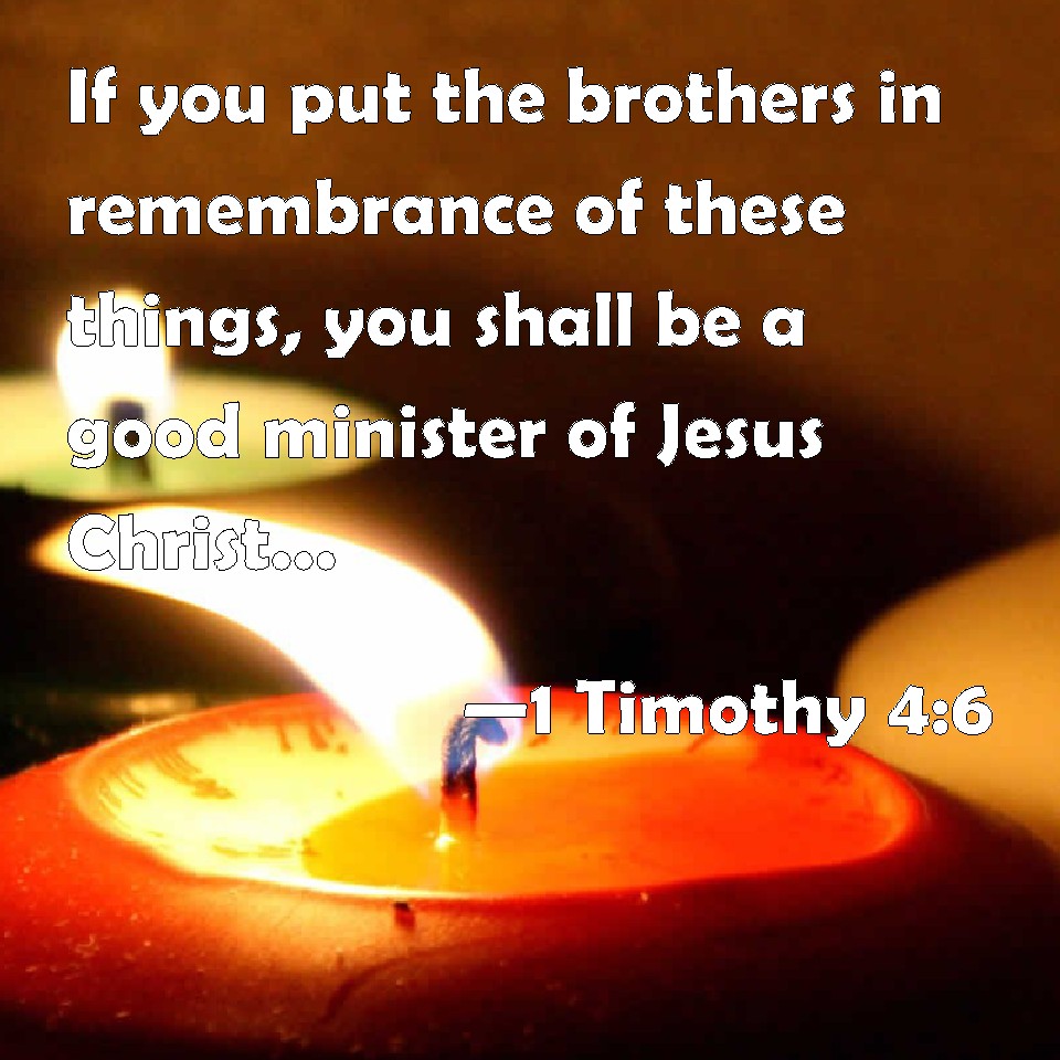 Choose a Background 1 Timothy 4:6 If you put the brothers in remembrance of these things, you shall be a good minister of Jesus Christ, nourished up in the words of faith and of good doctrine, whereunto you have attained. KJV: If thou put the brethren in remembrance of these things, thou shalt be a good minister of Jesus Christ, nourished up in the words of faith and of good doctrine, whereunto thou hast attained. DRB: These things proposing to the brethren, thou shalt be a good minister of Christ Jesus, nourished up in the words of faith, and of the good doctrine which thou hast attained unto. DBT: Laying these things before the brethren, thou wilt be a good minister of Christ Jesus, nourished with the words of the faith and of the good teaching which thou hast fully followed up. ERV: If thou put the brethren in mind of these things, thou shalt be a good minister of Christ Jesus, nourished in the words of the faith, and of the good doctrine which thou hast followed until now: WBT: If thou shalt put the brethren in remembrance of these things, thou wilt be a good minister of Jesus Christ, nourished by the words of faith and of good doctrine, to which thou hast attained. WEB: If you instruct the brothers of these things, you will be a good servant of Christ Jesus, nourished in the words of the faith, and of the good doctrine which you have followed. YLT: These things placing before the brethren, thou shalt be a good ministrant of Jesus Christ, being nourished by the words of the faith, and of the good teaching, which thou didst follow after,Links 1 Timothy 4:6 NIV • 1 Timothy 4:6 NLT • 1 Timothy 4:6 ESV • 1 Timothy 4:6 NASB • 1 Timothy 4:6 KJV • 1 Timothy 4:6 Interlinear • 1 Timothy 4:6 Commentaries • 1 Timothy 4:6 Parallel Texts • 1 Timothy 4:6 Bible Apps • 1 Timothy 4:6 Parallel • Bible Hub |