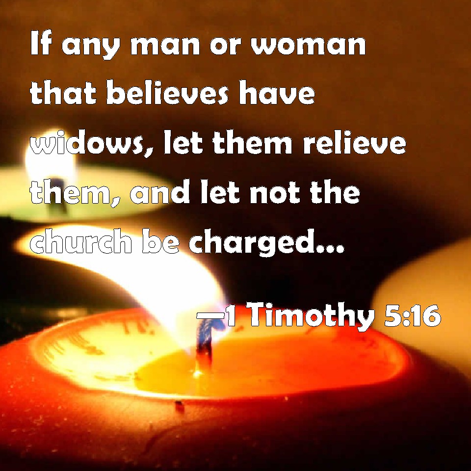 Choose a Background 1 Timothy 5:16 If any man or woman that believes have widows, let them relieve them, and let not the church be charged; that it may relieve them that are widows indeed. KJV: If any man or woman that believeth have widows, let them relieve them, and let not the church be charged; that it may relieve them that are widows indeed. DRB: If any of the faithful have widows, let him minister to them, and let not the church be charged: that there may be sufficient for them that are widows indeed. DBT: If any believing man or woman have widows, let them impart relief to them, and let not the assembly be charged, that it may impart relief to those that are widows indeed. ERV: If any woman that believeth hath widows, let her relieve them, and let not the church be burdened; that it may relieve them that are widows indeed. WBT: If any man or woman that believeth hath widows, let them relieve them, and let not the church be charged; that it may relieve them that are widows indeed. WEB: If any man or woman who believes has widows, let them relieve them, and don't let the assembly be burdened; that it might relieve those who are widows indeed. YLT: If any believing man or believing woman have widows, let them relieve them, and let not the assembly be burdened, that those really widows it may relieve.Links 1 Timothy 5:16 NIV • 1 Timothy 5:16 NLT • 1 Timothy 5:16 ESV • 1 Timothy 5:16 NASB • 1 Timothy 5:16 KJV • 1 Timothy 5:16 Interlinear • 1 Timothy 5:16 Commentaries • 1 Timothy 5:16 Parallel Texts • 1 Timothy 5:16 Bible Apps • 1 Timothy 5:16 Parallel • Bible Hub |