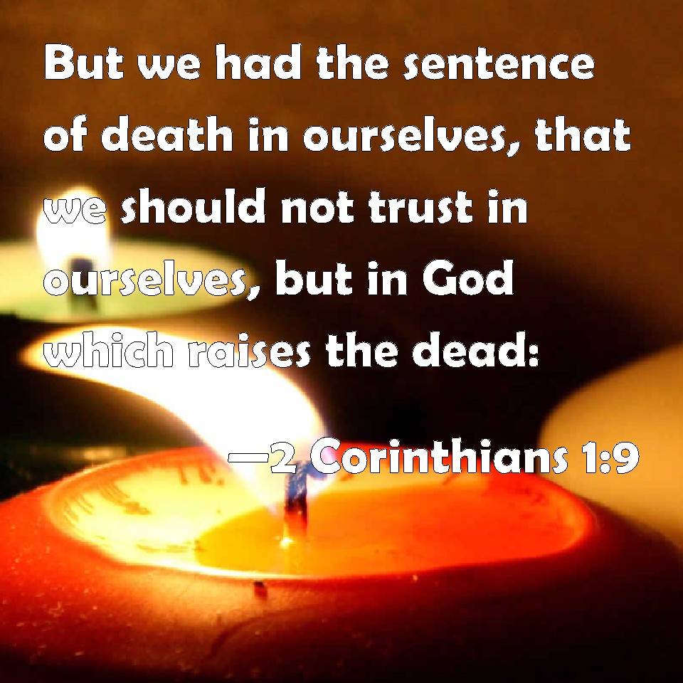 Choose a Background 2 Corinthians 1:9 But we had the sentence of death in ourselves, that we should not trust in ourselves, but in God which raises the dead: KJV: But we had the sentence of death in ourselves, that we should not trust in ourselves, but in God which raiseth the dead: DRB: But we had in ourselves the answer of death, that we should not trust in ourselves, but in God who raiseth the dead. DBT: But we ourselves had the sentence of death in ourselves, that we should not have our trust in ourselves, but in God who raises the dead; ERV: yea, we ourselves have had the answer of death within ourselves, that we should not trust in ourselves, but in God which raiseth the dead: WBT: But we had the sentence of death in ourselves, that we should not trust in ourselves, but in God who raiseth the dead: WEB: Yes, we ourselves have had the sentence of death within ourselves, that we should not trust in ourselves, but in God who raises the dead, YLT: but we ourselves in ourselves the sentence of the death have had, that we may not be trusting on ourselves, but on God, who is raising the dead,Links 2 Corinthians 1:9 NIV • 2 Corinthians 1:9 NLT • 2 Corinthians 1:9 ESV • 2 Corinthians 1:9 NASB • 2 Corinthians 1:9 KJV • 2 Corinthians 1:9 Interlinear • 2 Corinthians 1:9 Commentaries • 2 Corinthians 1:9 Parallel Texts • 2 Corinthians 1:9 Bible Apps • 2 Corinthians 1:9 Parallel • Bible Hub |