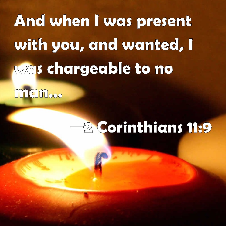 Choose a Background 2 Corinthians 11:9 And when I was present with you, and wanted, I was chargeable to no man: for that which was lacking to me the brothers which came from Macedonia supplied: and in all things I have kept myself from being burdensome to you, and so will I keep myself. KJV: And when I was present with you, and wanted, I was chargeable to no man: for that which was lacking to me the brethren which came from Macedonia supplied: and in all things I have kept myself from being burdensome unto you, and so will I keep myself. DRB: And, when I was present with you, and wanted, I was chargeable to no man: for that which was wanting to me, the brethren supplied who came from Macedonia; and in all things I have kept myself from being burthensome to you, and so I will keep myself. DBT: And being present with you and lacking, I did not lazily burden any one, (for the brethren who came from Macedonia supplied what I lacked,) and in everything I kept myself from being a burden to you, and will keep myself. ERV: and when I was present with you and was in want, I was not a burden on any man; for the brethren, when they came from Macedonia, supplied the measure of my want; and in everything I kept myself from being burdensome unto you, and so will I keep myself. WBT: And when I was present with you, and wanted, I was chargeable to no man: for that which was lacking to me the brethren who came from Macedonia supplied: and in all things I have kept myself from being burdensome to you, and so will I keep myself. WEB: When I was present with you and was in need, I wasn't a burden on anyone, for the brothers, when they came from Macedonia, supplied the measure of my need. In everything I kept myself from being burdensome to you, and I will continue to do so. YLT: and being present with you, and having been in want, I was chargeable to no one, for my lack did the brethren supply — having come from Macedonia — and in everything burdenless to you I did keep myself, and will keep.Links 2 Corinthians 11:9 NIV • 2 Corinthians 11:9 NLT • 2 Corinthians 11:9 ESV • 2 Corinthians 11:9 NASB • 2 Corinthians 11:9 KJV • 2 Corinthians 11:9 Interlinear • 2 Corinthians 11:9 Commentaries • 2 Corinthians 11:9 Parallel Texts • 2 Corinthians 11:9 Bible Apps • 2 Corinthians 11:9 Parallel • Bible Hub |