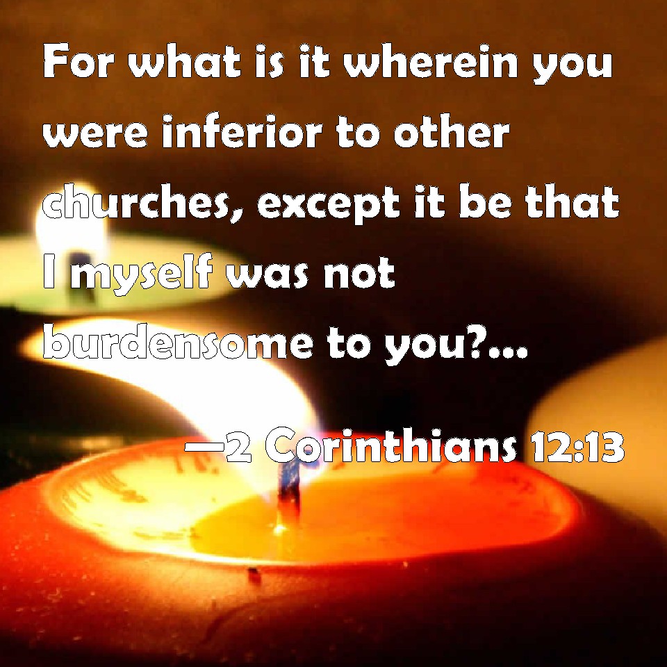 2 Corinthians 12:13 For what is it wherein you were inferior to other churches, except it be that I myself was not burdensome to you? forgive me this wrong.