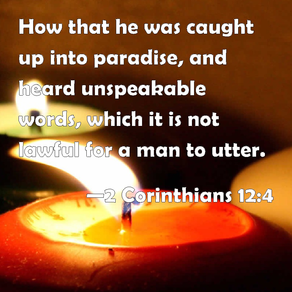 Choose a Background 2 Corinthians 12:4 How that he was caught up into paradise, and heard unspeakable words, which it is not lawful for a man to utter. KJV: How that he was caught up into paradise, and heard unspeakable words, which it is not lawful for a man to utter. DRB: That he was caught up into paradise, and heard secret words, which it is not granted to man to utter. DBT: that he was caught up into paradise, and heard unspeakable things said which it is not allowed to man to utter. ERV: how that he was caught up into Paradise, and heard unspeakable words, which it is not lawful for a man to utter. WBT: That he was caught up into paradise, and heard unspeakable words, which it is not lawful for a man to utter. WEB: how he was caught up into Paradise, and heard unspeakable words, which it is not lawful for a man to utter. YLT: that he was caught away to the paradise, and heard unutterable sayings, that it is not possible for man to speak.Links 2 Corinthians 12:4 NIV • 2 Corinthians 12:4 NLT • 2 Corinthians 12:4 ESV • 2 Corinthians 12:4 NASB • 2 Corinthians 12:4 KJV • 2 Corinthians 12:4 Interlinear • 2 Corinthians 12:4 Commentaries • 2 Corinthians 12:4 Parallel Texts • 2 Corinthians 12:4 Bible Apps • 2 Corinthians 12:4 Parallel • Bible Hub |