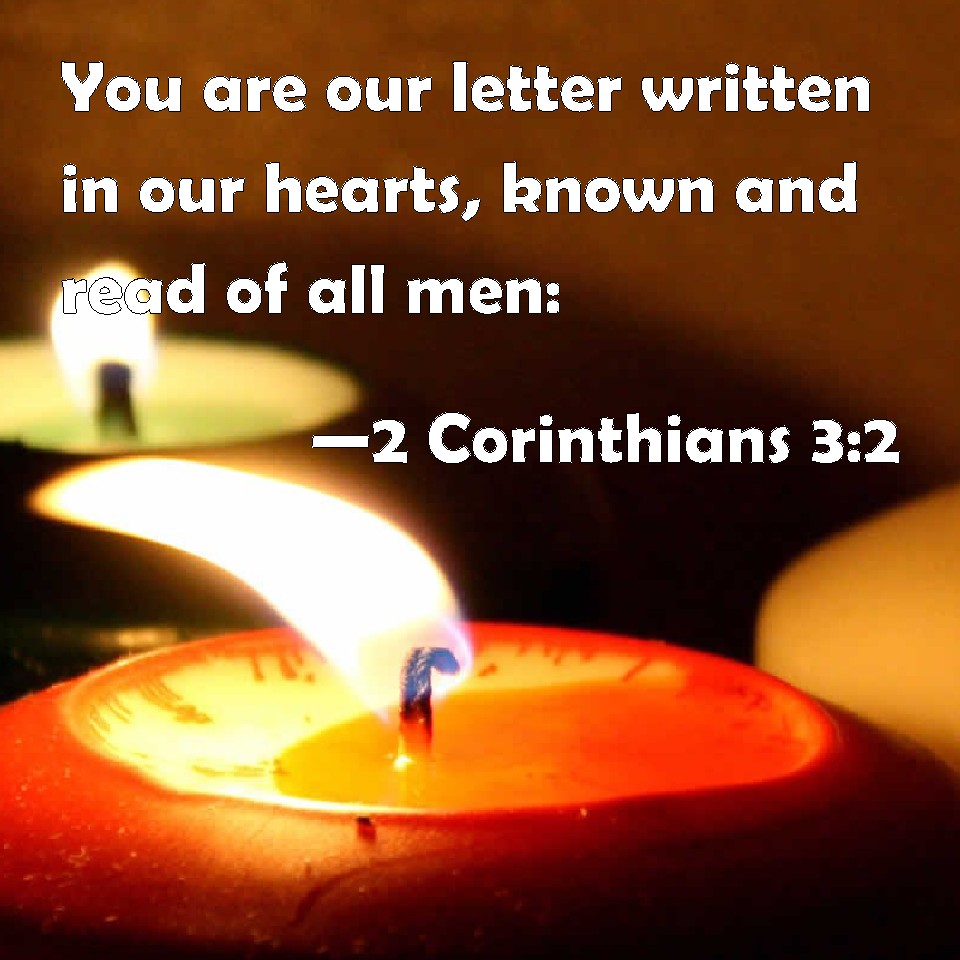Choose a Background 2 Corinthians 3:2 You are our letter written in our hearts, known and read of all men: KJV: Ye are our epistle written in our hearts, known and read of all men: DRB: You are our epistle, written in our hearts, which is known and read by all men: DBT: Ye are our letter, written in our hearts, known and read of all men, ERV: Ye are our epistle, written in our hearts, known and read of all men; WBT: Ye are our epistle written in our hearts, known and read by all men: WEB: You are our letter, written in our hearts, known and read by all men; YLT: our letter ye are, having been written in our hearts, known and read by all men,Links 2 Corinthians 3:2 NIV • 2 Corinthians 3:2 NLT • 2 Corinthians 3:2 ESV • 2 Corinthians 3:2 NASB • 2 Corinthians 3:2 KJV • 2 Corinthians 3:2 Interlinear • 2 Corinthians 3:2 Commentaries • 2 Corinthians 3:2 Parallel Texts • 2 Corinthians 3:2 Bible Apps • 2 Corinthians 3:2 Parallel • Bible Hub |
