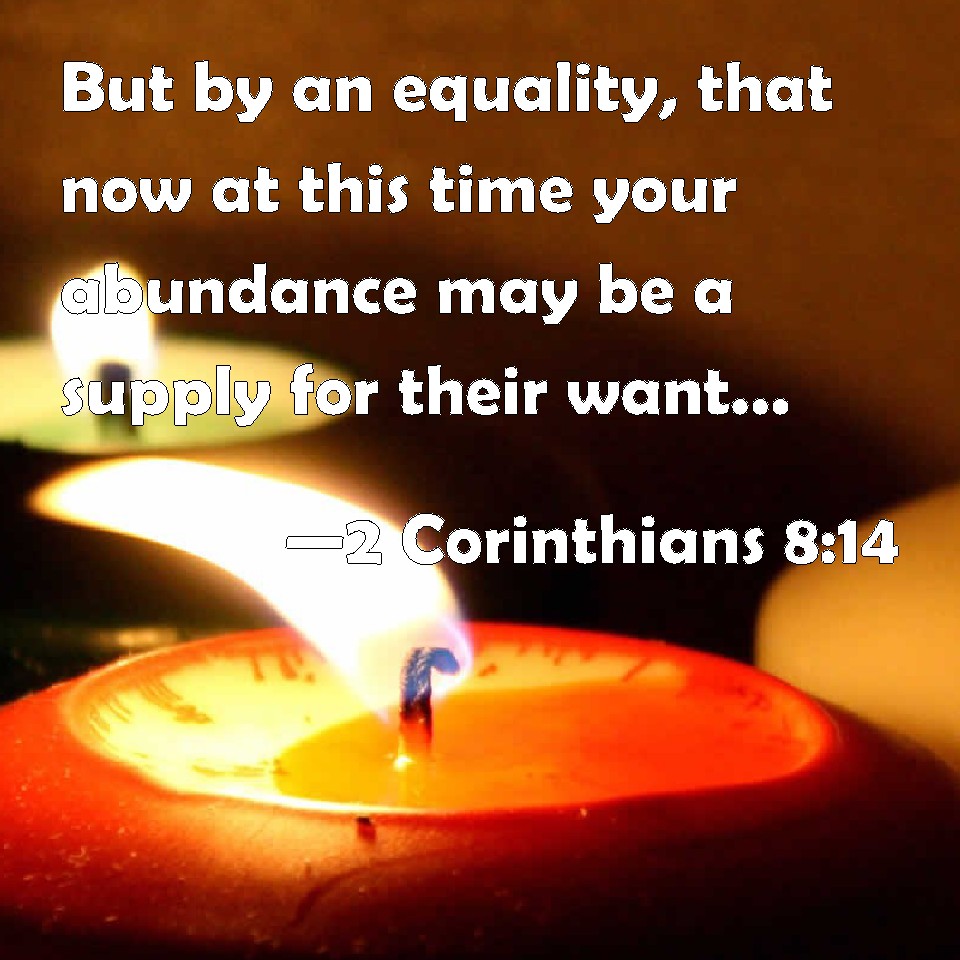 Choose a Background 2 Corinthians 8:14 But by an equality, that now at this time your abundance may be a supply for their want, that their abundance also may be a supply for your want: that there may be equality: KJV: But by an equality, that now at this time your abundance may be a supply for their want, that their abundance also may be a supply for your want: that there may be equality: DRB: In this present time let your abundance supply their want, that their abundance also may supply your want, that there may be an equality, DBT: but on the principle of equality; in the present time your abundance for their lack, that their abundance may be for your lack, so that there should be equality. ERV: but by equality; your abundance being a supply at this present time for their want, that their abundance also may become a supply for your want; that there may be equality: WBT: But by an equality, that now at this time your abundance may be a supply for their want, that their abundance also may be a supply for your want: that there may be equality: WEB: but for equality. Your abundance at this present time supplies their lack, that their abundance also may become a supply for your lack; that there may be equality. YLT: but by equality, at the present time your abundance — for their want, that also their abundance may be for your want, that there may be equality,Links 2 Corinthians 8:14 NIV • 2 Corinthians 8:14 NLT • 2 Corinthians 8:14 ESV • 2 Corinthians 8:14 NASB • 2 Corinthians 8:14 KJV • 2 Corinthians 8:14 Interlinear • 2 Corinthians 8:14 Commentaries • 2 Corinthians 8:14 Parallel Texts • 2 Corinthians 8:14 Bible Apps • 2 Corinthians 8:14 Parallel • Bible Hub |
