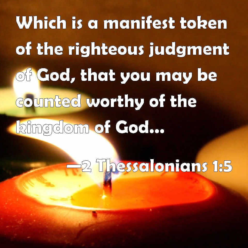 Choose a Background 2 Thessalonians 1:5 Which is a manifest token of the righteous judgment of God, that you may be counted worthy of the kingdom of God, for which you also suffer: KJV: Which is a manifest token of the righteous judgment of God, that ye may be counted worthy of the kingdom of God, for which ye also suffer: DRB: For an example of the just judgment of God, that you may be counted worthy of the kingdom of God, for which also you suffer. DBT: a manifest token of the righteous judgment of God, to the end that ye should be counted worthy of the kingdom of God, for the sake of which ye also suffer; ERV: which is a manifest token of the righteous judgment of God; to the end that ye may be counted worthy of the kingdom of God, for which ye also suffer: WBT: Which is a manifest token of the righteous judgment of God, that ye may be counted worthy of the kingdom of God, for which ye also suffer: WEB: This is an obvious sign of the righteous judgment of God, to the end that you may be counted worthy of the Kingdom of God, for which you also suffer. YLT: a token of the righteous judgment of God, for your being counted worthy of the reign of God, for which also ye suffer,Links 2 Thessalonians 1:5 NIV • 2 Thessalonians 1:5 NLT • 2 Thessalonians 1:5 ESV • 2 Thessalonians 1:5 NASB • 2 Thessalonians 1:5 KJV • 2 Thessalonians 1:5 Interlinear • 2 Thessalonians 1:5 Commentaries • 2 Thessalonians 1:5 Parallel Texts • 2 Thessalonians 1:5 Bible Apps • 2 Thessalonians 1:5 Parallel • Bible Hub |