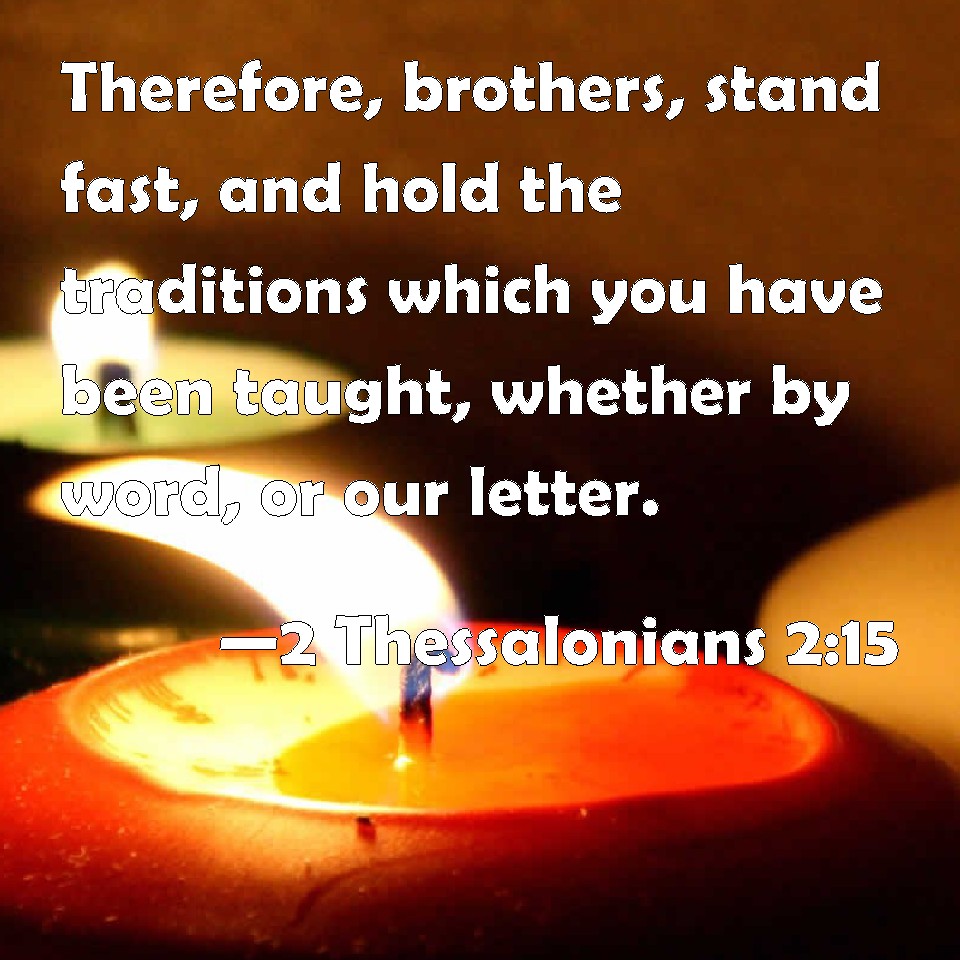 Choose a Background 2 Thessalonians 2:15 Therefore, brothers, stand fast, and hold the traditions which you have been taught, whether by word, or our letter. KJV: Therefore, brethren, stand fast, and hold the traditions which ye have been taught, whether by word, or our epistle. DRB: Therefore, brethren, stand fast; and hold the traditions which you have learned, whether by word, or by our epistle. DBT: So then, brethren, stand firm, and hold fast the instructions which ye have been taught, whether by word or by our letter. ERV: So then, brethren, stand fast, and hold the traditions which ye were taught, whether by word, or by epistle of ours. WBT: Therefore, brethren, stand fast, and hold the traditions which ye have been taught, whether by word, or our epistle. WEB: So then, brothers, stand firm, and hold the traditions which you were taught by us, whether by word, or by letter. YLT: so, then, brethren, stand ye fast, and hold the deliverances that ye were taught, whether through word, whether through our letter;Links 2 Thessalonians 2:15 NIV • 2 Thessalonians 2:15 NLT • 2 Thessalonians 2:15 ESV • 2 Thessalonians 2:15 NASB • 2 Thessalonians 2:15 KJV • 2 Thessalonians 2:15 Interlinear • 2 Thessalonians 2:15 Commentaries • 2 Thessalonians 2:15 Parallel Texts • 2 Thessalonians 2:15 Bible Apps • 2 Thessalonians 2:15 Parallel • Bible Hub |