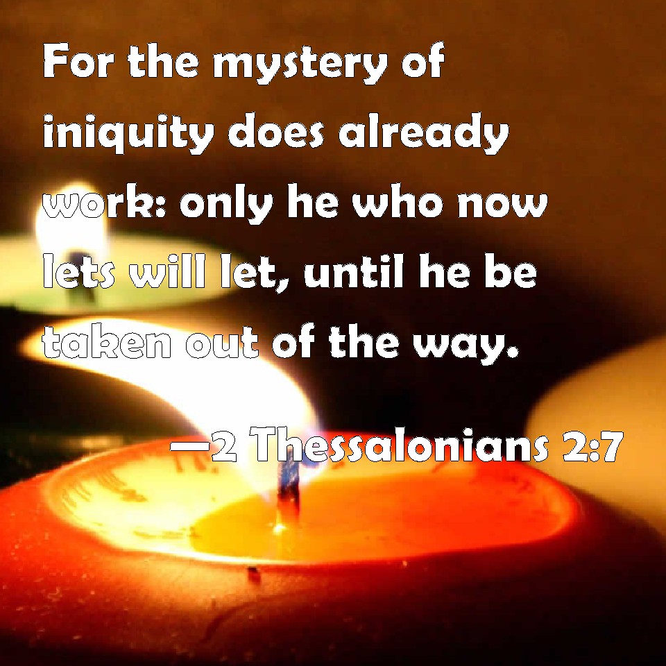 Choose a Background 2 Thessalonians 2:7 For the mystery of iniquity does already work: only he who now lets will let, until he be taken out of the way. KJV: For the mystery of iniquity doth already work: only he who now letteth will let, until he be taken out of the way. DRB: For the mystery of iniquity already worketh; only that he who now holdeth, do hold, until he be taken out of the way. DBT: For the mystery of lawlessness already works; only there is he who restrains now until he be gone, ERV: For the mystery of lawlessness doth already work: only there is one that restraineth now, until he be taken out of the way. WBT: For the mystery of iniquity doth already work: only he who now restraineth will restrain, until he be taken out of the way. WEB: For the mystery of lawlessness already works. Only there is one who restrains now, until he is taken out of the way. YLT: for the secret of the lawlessness doth already work, only he who is keeping down now will hinder — till he may be out of the way,Links 2 Thessalonians 2:7 NIV • 2 Thessalonians 2:7 NLT • 2 Thessalonians 2:7 ESV • 2 Thessalonians 2:7 NASB • 2 Thessalonians 2:7 KJV • 2 Thessalonians 2:7 Interlinear • 2 Thessalonians 2:7 Commentaries • 2 Thessalonians 2:7 Parallel Texts • 2 Thessalonians 2:7 Bible Apps • 2 Thessalonians 2:7 Parallel • Bible Hub |