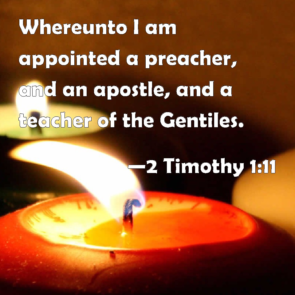 Choose a Background 2 Timothy 1:11 Whereunto I am appointed a preacher, and an apostle, and a teacher of the Gentiles. KJV: Whereunto I am appointed a preacher, and an apostle, and a teacher of the Gentiles. DRB: Wherein I am appointed a preacher, and an apostle, and teacher of the Gentiles. DBT: to which I have been appointed a herald and apostle and teacher of the nations. ERV: whereunto I was appointed a preacher, and an apostle, and a teacher. WBT: To which I am appointed a preacher, and an apostle, and a teacher of the Gentiles. WEB: For this, I was appointed as a preacher, an apostle, and a teacher of the Gentiles. YLT: to which I was placed a preacher and an apostle, and a teacher of nations,Links 2 Timothy 1:11 NIV • 2 Timothy 1:11 NLT • 2 Timothy 1:11 ESV • 2 Timothy 1:11 NASB • 2 Timothy 1:11 KJV • 2 Timothy 1:11 Interlinear • 2 Timothy 1:11 Commentaries • 2 Timothy 1:11 Parallel Texts • 2 Timothy 1:11 Bible Apps • 2 Timothy 1:11 Parallel • Bible Hub |