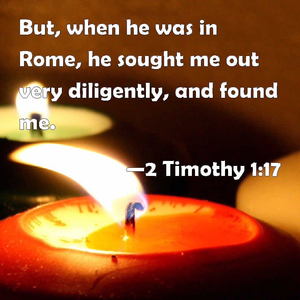 Choose a Background 2 Timothy 1:17 But, when he was in Rome, he sought me out very diligently, and found me. KJV: But, when he was in Rome, he sought me out very diligently, and found me. DRB: But when he was come to Rome, he carefully sought me, and found me. DBT: but being in Rome sought me out very diligently, and found me — ERV: but, when he was in Rome, he sought me diligently, and found me WBT: But, when he was in Rome, he sought me out very diligently, and found me. WEB: but when he was in Rome, he sought me diligently, and found me YLT: but being in Rome, very diligently he sought me, and found;Links 2 Timothy 1:17 NIV • 2 Timothy 1:17 NLT • 2 Timothy 1:17 ESV • 2 Timothy 1:17 NASB • 2 Timothy 1:17 KJV • 2 Timothy 1:17 Interlinear • 2 Timothy 1:17 Commentaries • 2 Timothy 1:17 Parallel Texts • 2 Timothy 1:17 Bible Apps • 2 Timothy 1:17 Parallel • Bible Hub |
