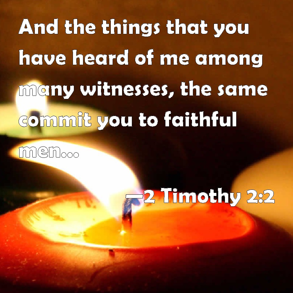 Choose a Background 2 Timothy 2:2 And the things that you have heard of me among many witnesses, the same commit you to faithful men, who shall be able to teach others also. KJV: And the things that thou hast heard of me among many witnesses, the same commit thou to faithful men, who shall be able to teach others also. DRB: And the things which thou hast heard of me by many witnesses, the same commend to faithful men, who shall be fit to teach others also. DBT: And the things thou hast heard of me in the presence of many witnesses, these entrust to faithful men, such as shall be competent to instruct others also. ERV: And the things which thou hast heard from me among many witnesses, the same commit thou to faithful men, who shall be able to teach others also. WBT: And the things that thou hast heard from me among many witnesses, the same commit thou to faithful men, who shall be able to teach others also. WEB: The things which you have heard from me among many witnesses, commit the same to faithful men, who will be able to teach others also. YLT: and the things that thou didst hear from me through many witnesses, these things be committing to stedfast men, who shall be sufficient also others to teach;Links 2 Timothy 2:2 NIV • 2 Timothy 2:2 NLT • 2 Timothy 2:2 ESV • 2 Timothy 2:2 NASB • 2 Timothy 2:2 KJV • 2 Timothy 2:2 Interlinear • 2 Timothy 2:2 Commentaries • 2 Timothy 2:2 Parallel Texts • 2 Timothy 2:2 Bible Apps • 2 Timothy 2:2 Parallel • Bible Hub |