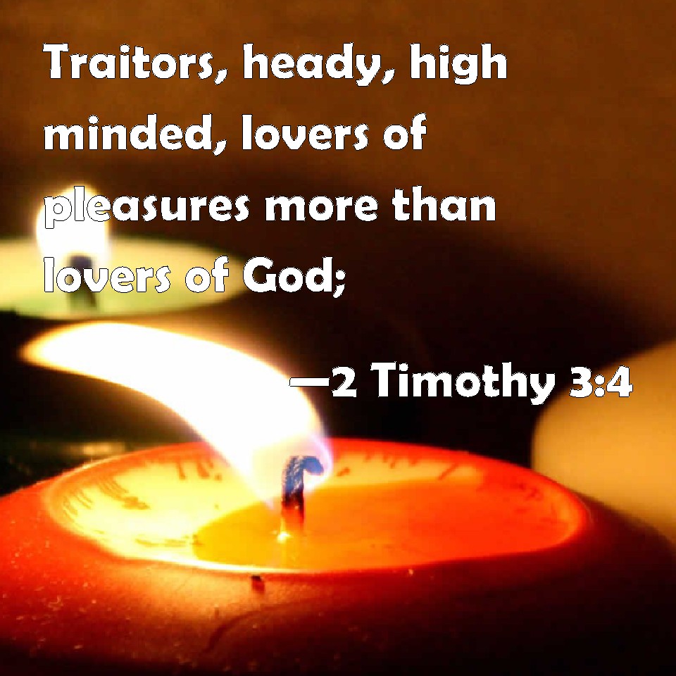 Choose a Background 2 Timothy 3:4 Traitors, heady, high minded, lovers of pleasures more than lovers of God; KJV: Traitors, heady, highminded, lovers of pleasures more than lovers of God; DRB: Traitors, stubborn, puffed up, and lovers of pleasures more than of God: DBT: traitors, headlong, of vain pretensions, lovers of pleasure rather than lovers of God; ERV: traitors, headstrong, puffed up, lovers of pleasure rather than lovers of God; WBT: Traitors, heady, high-minded, lovers of pleasures more than lovers of God; WEB: traitors, headstrong, conceited, lovers of pleasure rather than lovers of God; YLT: traitors, heady, lofty, lovers of pleasure more than lovers of God,Links 2 Timothy 3:4 NIV • 2 Timothy 3:4 NLT • 2 Timothy 3:4 ESV • 2 Timothy 3:4 NASB • 2 Timothy 3:4 KJV • 2 Timothy 3:4 Interlinear • 2 Timothy 3:4 Commentaries • 2 Timothy 3:4 Parallel Texts • 2 Timothy 3:4 Bible Apps • 2 Timothy 3:4 Parallel • Bible Hub |