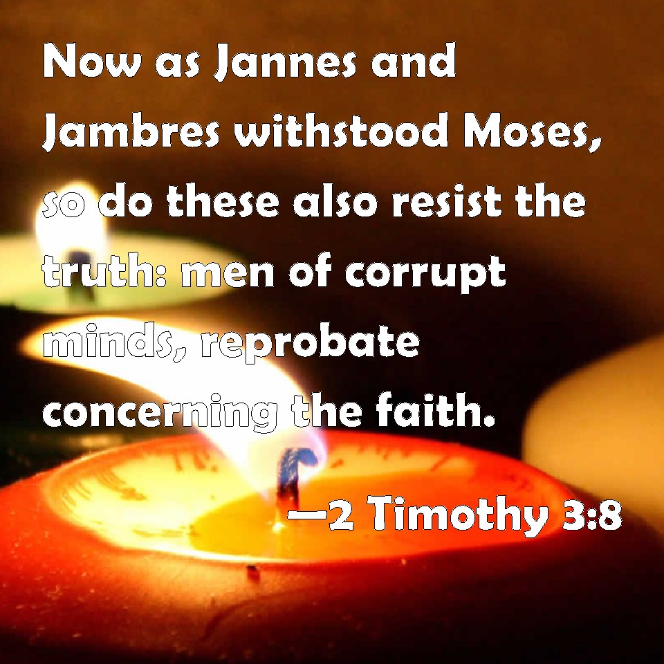Choose a Background 2 Timothy 3:8 Now as Jannes and Jambres withstood Moses, so do these also resist the truth: men of corrupt minds, reprobate concerning the faith. KJV: Now as Jannes and Jambres withstood Moses, so do these also resist the truth: men of corrupt minds, reprobate concerning the faith. DRB: Now as Jannes and Mambres resisted Moses, so these also resist the truth, men corrupted in mind, reprobate concerning the faith. DBT: Now in the same manner in which Jannes and Jambres withstood Moses, thus these also withstand the truth; men corrupted in mind, found worthless as regards the faith. ERV: And like as Jannes and Jambres withstood Moses, so do these also withstand the truth; men corrupted in mind, reprobate concerning the faith. WBT: Now as Jannes and Jambres withstood Moses, so do these also resist the truth: men of corrupt minds, reprobate concerning the faith. WEB: Even as Jannes and Jambres opposed Moses, so do these also oppose the truth; men corrupted in mind, who concerning the faith, are rejected. YLT: and, even as Jannes and Jambres stood against Moses, so also these do stand against the truth, men corrupted in mind, disapproved concerning the faith;Links 2 Timothy 3:8 NIV • 2 Timothy 3:8 NLT • 2 Timothy 3:8 ESV • 2 Timothy 3:8 NASB • 2 Timothy 3:8 KJV • 2 Timothy 3:8 Interlinear • 2 Timothy 3:8 Commentaries • 2 Timothy 3:8 Parallel Texts • 2 Timothy 3:8 Bible Apps • 2 Timothy 3:8 Parallel • Bible Hub |