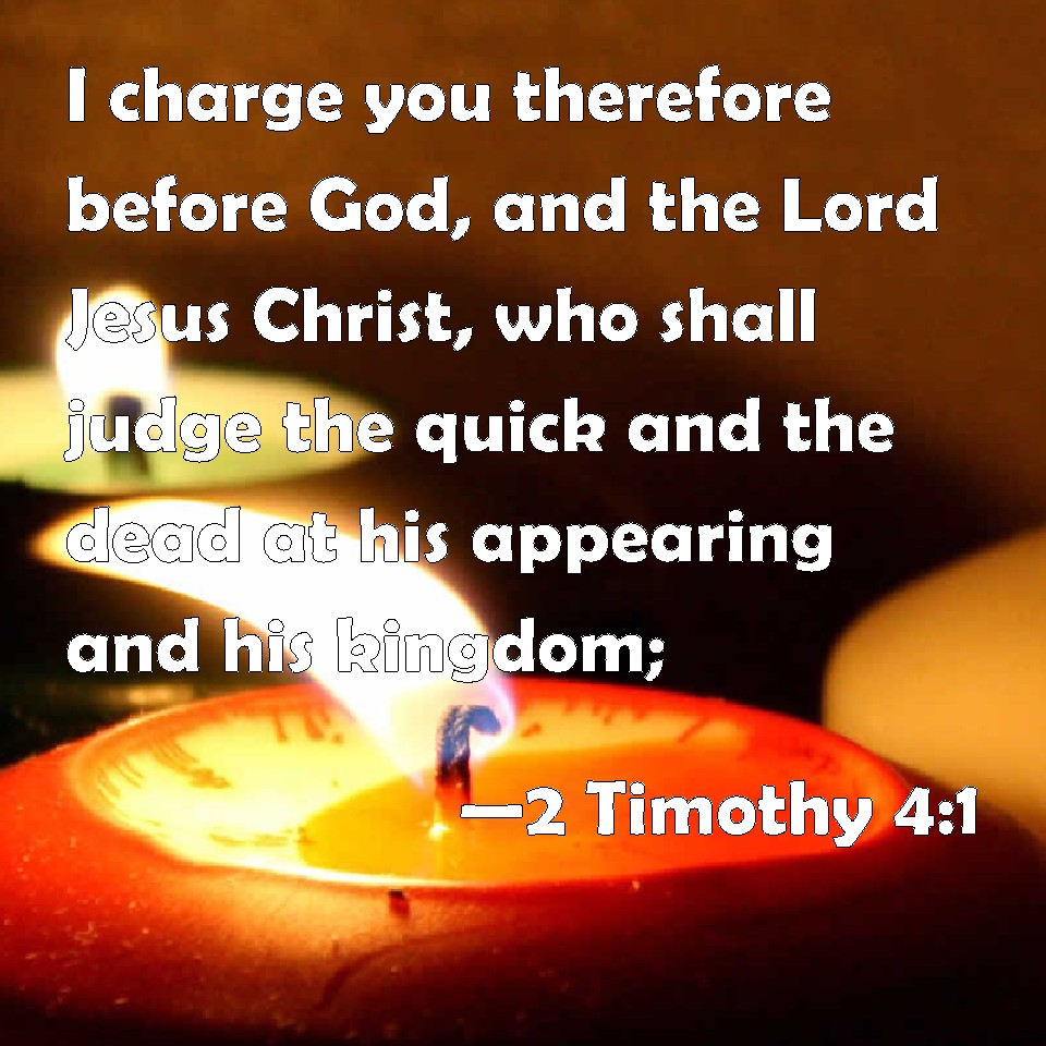 Choose a Background 2 Timothy 4:1 I charge you therefore before God, and the Lord Jesus Christ, who shall judge the quick and the dead at his appearing and his kingdom; KJV: I charge thee therefore before God, and the Lord Jesus Christ, who shall judge the quick and the dead at his appearing and his kingdom; DRB: I charge thee, before God and Jesus Christ, who shall judge the living and the dead, by his coming, and his kingdom: DBT: I testify before God and Christ Jesus, who is about to judge living and dead, and by his appearing and his kingdom, ERV: I charge thee in the sight of God, and of Christ Jesus, who shall judge the quick and the dead, and by his appearing and his kingdom; WBT: I charge thee therefore before God, and the Lord Jesus Christ, who will judge the living and the dead at his appearing and his kingdom; WEB: I command you therefore before God and the Lord Jesus Christ, who will judge the living and the dead at his appearing and his Kingdom: YLT: I do fully testify, then, before God, and the Lord Jesus Christ, who is about to judge living and dead at his manifestation and his reign — Links 2 Timothy 4:1 NIV • 2 Timothy 4:1 NLT • 2 Timothy 4:1 ESV • 2 Timothy 4:1 NASB • 2 Timothy 4:1 KJV • 2 Timothy 4:1 Interlinear • 2 Timothy 4:1 Commentaries • 2 Timothy 4:1 Parallel Texts • 2 Timothy 4:1 Bible Apps • 2 Timothy 4:1 Parallel • Bible Hub |