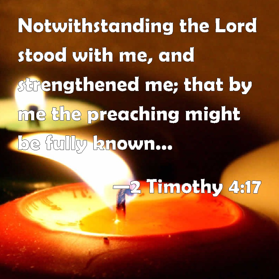 Choose a Background 2 Timothy 4:17 Notwithstanding the Lord stood with me, and strengthened me; that by me the preaching might be fully known, and that all the Gentiles might hear: and I was delivered out of the mouth of the lion. KJV: Notwithstanding the Lord stood with me, and strengthened me; that by me the preaching might be fully known, and that all the Gentiles might hear: and I was delivered out of the mouth of the lion. DRB: But the Lord stood by me, and strengthened me, that by me the preaching may be accomplished, and that all the Gentiles may hear: and I was delivered out of the mouth of the lion. DBT: But the Lord stood with me, and gave me power, that through me the proclamation might be fully made, and all those of the nations should hear; and I was delivered out of the lion's mouth. ERV: But the Lord stood by me, and strengthened me; that through me the message might be fully proclaimed, and that all the Gentiles might hear: and I was delivered out of the mouth of the lion. WBT: Notwithstanding, the Lord stood with me, and strengthened me; that by me the preaching might be fully known, and that all the Gentiles might hear: and I was delivered out of the mouth of the lion. WEB: But the Lord stood by me, and strengthened me, that through me the message might be fully proclaimed, and that all the Gentiles might hear; and I was delivered out of the mouth of the lion. YLT: and the Lord stood by me, and did strengthen me, that through me the preaching might be fully assured, and all the nations might hear, and I was freed out of the mouth of a lion,Links 2 Timothy 4:17 NIV • 2 Timothy 4:17 NLT • 2 Timothy 4:17 ESV • 2 Timothy 4:17 NASB • 2 Timothy 4:17 KJV • 2 Timothy 4:17 Interlinear • 2 Timothy 4:17 Commentaries • 2 Timothy 4:17 Parallel Texts • 2 Timothy 4:17 Bible Apps • 2 Timothy 4:17 Parallel • Bible Hub |