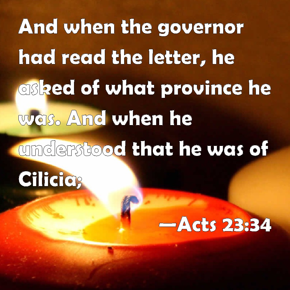 Choose a Background Acts 23:34 And when the governor had read the letter, he asked of what province he was. And when he understood that he was of Cilicia; KJV: And when the governor had read the letter, he asked of what province he was. And when he understood that he was of Cilicia; DRB: And when he had read it, and had asked of what province he was, and understood that he was of Cilicia; DBT: And having read it, and asked of what eparchy he was, and learned that he was of Cilicia, ERV: And when he had read it, he asked of what province he was; and when he understood that he was of Cilicia, WBT: And when the governor had read the letter, he asked of what province he was. And when he understood that he was of Cilicia, WEB: When the governor had read it, he asked what province he was from. When he understood that he was from Cilicia, he said, YLT: And the governor having read it, and inquired of what province he is, and understood that he is from Cilicia;Links Acts 23:34 NIV • Acts 23:34 NLT • Acts 23:34 ESV • Acts 23:34 NASB • Acts 23:34 KJV • Acts 23:34 Interlinear • Acts 23:34 Commentaries • Acts 23:34 Parallel Texts • Acts 23:34 Bible Apps • Acts 23:34 Parallel • Bible Hub |