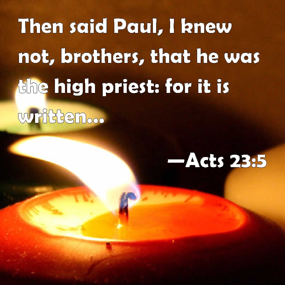 Choose a Background Acts 23:5 Then said Paul, I knew not, brothers, that he was the high priest: for it is written, You shall not speak evil of the ruler of your people. KJV: Then said Paul, I wist not, brethren, that he was the high priest: for it is written, Thou shalt not speak evil of the ruler of thy people. DRB: And Paul said: I knew not, brethren, that he is the high priest. For it is written: Thou shalt not speak evil of the prince of thy people. DBT: And Paul said, I was not conscious, brethren, that he was high priest; for it is written, Thou shalt not speak evilly of the ruler of thy people. ERV: And Paul said, I wist not, brethren, that he was high priest: for it is written, Thou shalt not speak evil of a ruler of thy people. WBT: Then said Paul, I knew not, brethren, that he is the high priest: for it is written, Thou shalt not speak evil of the ruler of thy people. WEB: Paul said, "I didn't know, brothers, that he was high priest. For it is written, 'You shall not speak evil of a ruler of your people.'" YLT: and Paul said, 'I did not know, brethren, that he is chief priest: for it hath been written, Of the ruler of thy people thou shalt not speak evil;'Links Acts 23:5 NIV • Acts 23:5 NLT • Acts 23:5 ESV • Acts 23:5 NASB • Acts 23:5 KJV • Acts 23:5 Interlinear • Acts 23:5 Commentaries • Acts 23:5 Parallel Texts • Acts 23:5 Bible Apps • Acts 23:5 Parallel • Bible Hub |
