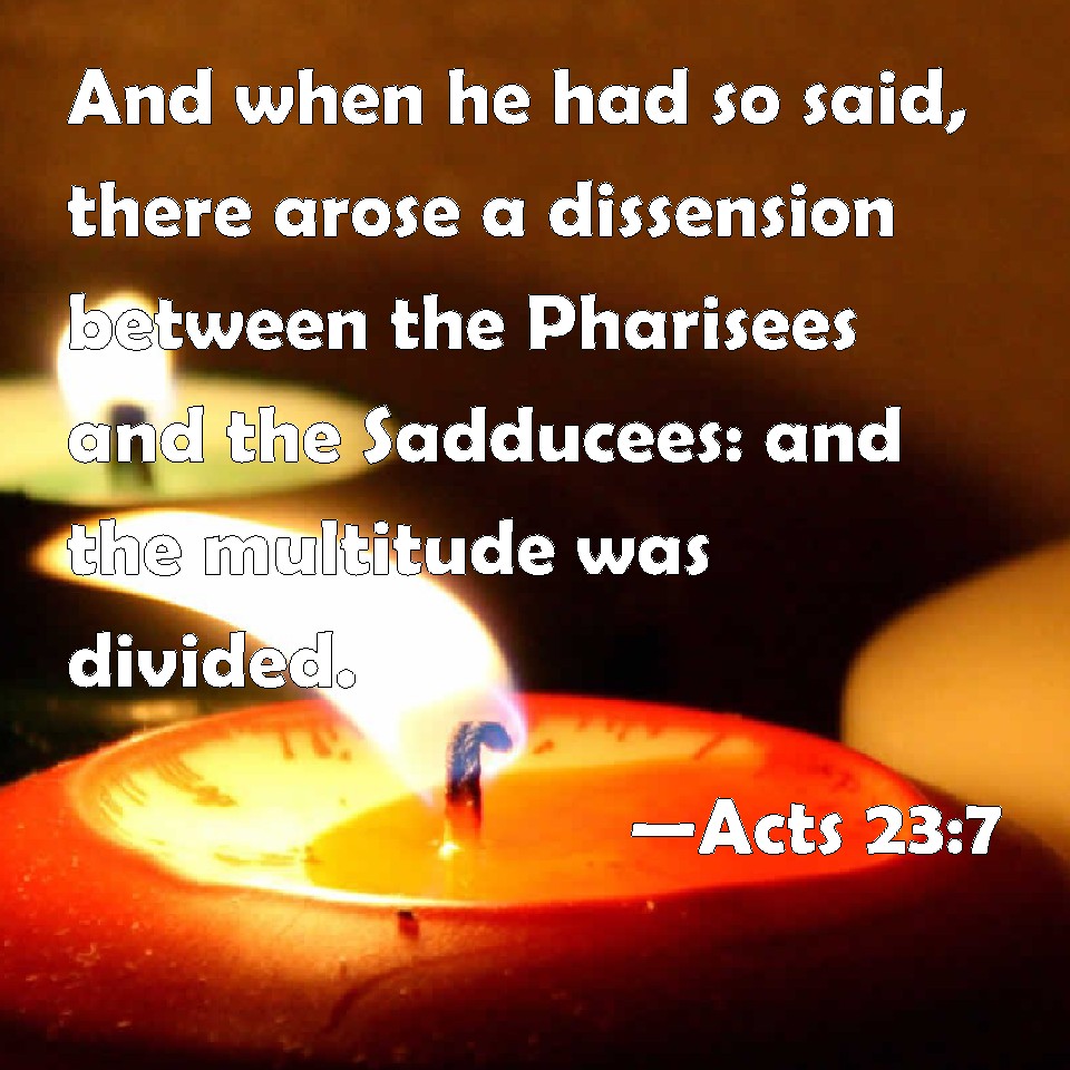 Choose a Background Acts 23:7 And when he had so said, there arose a dissension between the Pharisees and the Sadducees: and the multitude was divided. KJV: And when he had so said, there arose a dissension between the Pharisees and the Sadducees: and the multitude was divided. DRB: And when he had so said, there arose a dissension between the Pharisees and the Sadducees; and the multitude was divided. DBT: And when he had spoken this, there was a tumult of the Pharisees and the Sadducees, and the multitude was divided. ERV: And when he had so said, there arose a dissension between the Pharisees and Sadducees: and the assembly was divided. WBT: And when he had so said, there arose a dissension between the Pharisees and the Sadducees: and the multitude was divided. WEB: When he had said this, an argument arose between the Pharisees and Sadducees, and the assembly was divided. YLT: And he having spoken this, there came a dissension of the Pharisees and of the Sadducees, and the crowd was divided,Links Acts 23:7 NIV • Acts 23:7 NLT • Acts 23:7 ESV • Acts 23:7 NASB • Acts 23:7 KJV • Acts 23:7 Interlinear • Acts 23:7 Commentaries • Acts 23:7 Parallel Texts • Acts 23:7 Bible Apps • Acts 23:7 Parallel • Bible Hub |
