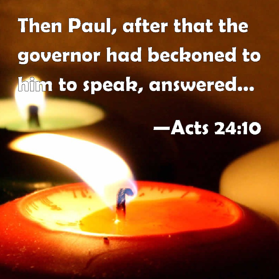 Choose a Background Acts 24:10 Then Paul, after that the governor had beckoned to him to speak, answered, For as much as I know that you have been of many years a judge to this nation, I do the more cheerfully answer for myself: KJV: Then Paul, after that the governor had beckoned unto him to speak, answered, Forasmuch as I know that thou hast been of many years a judge unto this nation, I do the more cheerfully answer for myself: DRB: Then Paul answered, (the governor making a sign to him to speak:) Knowing that for many years thou hast been judge over this nation, I will with good courage answer for myself. DBT: But Paul, the governor having beckoned to him to speak, answered, Knowing that for many years thou hast been judge to this nation, I answer readily as to the things which concern myself. ERV: And when the governor had beckoned unto him to speak, Paul answered, Forasmuch as I know that thou hast been of many years a judge unto this nation, I do cheerfully make my defence: WBT: Then Paul, after the governor had beckoned to him to speak, answered, Forasmuch as I know that thou hast been for many years a judge to this nation, I do the more cheerfully answer for myself: WEB: When the governor had beckoned to him to speak, Paul answered, "Because I know that you have been a judge of this nation for many years, I cheerfully make my defense, YLT: And Paul answered — the governor having beckoned to him to speak — 'Knowing that for many years thou hast been a judge to this nation, the more cheerfully the things concerning myself I do answer;Links Acts 24:10 NIV • Acts 24:10 NLT • Acts 24:10 ESV • Acts 24:10 NASB • Acts 24:10 KJV • Acts 24:10 Interlinear • Acts 24:10 Commentaries • Acts 24:10 Parallel Texts • Acts 24:10 Bible Apps • Acts 24:10 Parallel • Bible Hub |
