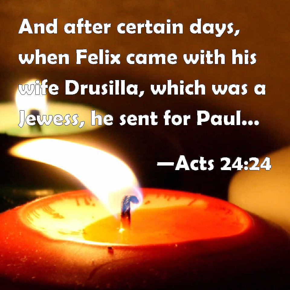 Choose a Background Acts 24:24 And after certain days, when Felix came with his wife Drusilla, which was a Jewess, he sent for Paul, and heard him concerning the faith in Christ. KJV: And after certain days, when Felix came with his wife Drusilla, which was a Jewess, he sent for Paul, and heard him concerning the faith in Christ. DRB: And after some days, Felix, coming with Drusilla his wife, who was a Jew, sent for Paul, and heard of him the faith, that is in Christ Jesus. DBT: And after certain days, Felix having arrived with Drusilla his wife, who was a Jewess, he sent for Paul and heard him concerning the faith in Christ. ERV: But after certain days, Felix came with Drusilla, his wife, which was a Jewess, and sent for Paul, and heard him concerning the faith in Christ Jesus. WBT: And after certain days, when Felix came with his wife Drusilla, who was a Jewess, he sent for Paul, and heard him concerning the faith in Christ. WEB: But after some days, Felix came with Drusilla, his wife, who was a Jewess, and sent for Paul, and heard him concerning the faith in Christ Jesus. YLT: And after certain days, Felix having come with Drusilla his wife, being a Jewess, he sent for Paul, and heard him concerning the faith toward Christ,Links Acts 24:24 NIV • Acts 24:24 NLT • Acts 24:24 ESV • Acts 24:24 NASB • Acts 24:24 KJV • Acts 24:24 Interlinear • Acts 24:24 Commentaries • Acts 24:24 Parallel Texts • Acts 24:24 Bible Apps • Acts 24:24 Parallel • Bible Hub |