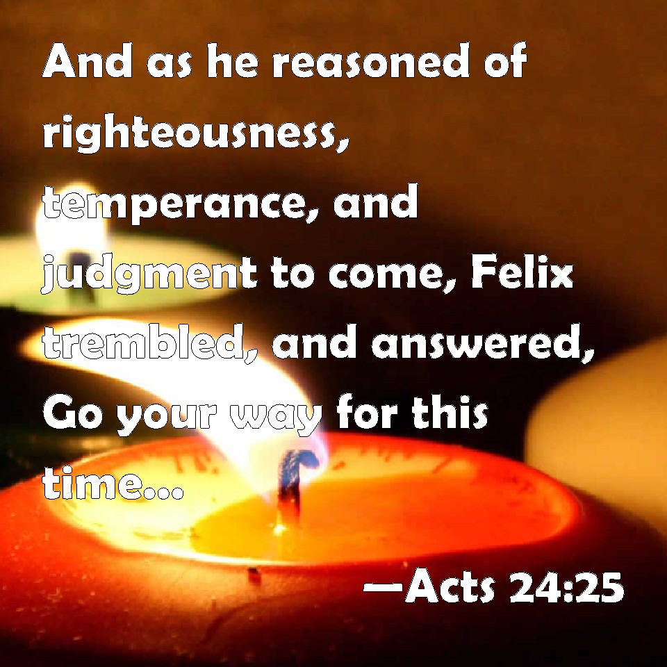 Choose a Background Acts 24:25 And as he reasoned of righteousness, temperance, and judgment to come, Felix trembled, and answered, Go your way for this time; when I have a convenient season, I will call for you. KJV: And as he reasoned of righteousness, temperance, and judgment to come, Felix trembled, and answered, Go thy way for this time; when I have a convenient season, I will call for thee. DRB: And as he treated of justice, and chastity, and of the judgment to come, Felix being terrified, answered: For this time, go thy way: but when I have a convenient time, I will send for thee. DBT: And as he reasoned concerning righteousness, and temperance, and the judgment about to come, Felix, being filled with fear, answered, Go for the present, and when I get an opportunity I will send for thee; ERV: And as he reasoned of righteousness, and temperance, and the judgment to come, Felix was terrified, and answered, Go thy way for this time; and when I have a convenient season, I will call thee unto me. WBT: And as he reasoned of righteousness, temperance, and judgment to come, Felix trembled, and answered, depart for this time; when I have a convenient season, I will call for thee. WEB: As he reasoned about righteousness, self-control, and the judgment to come, Felix was terrified, and answered, "Go your way for this time, and when it is convenient for me, I will summon you." YLT: and he reasoning concerning righteousness, and temperance, and the judgment that is about to be, Felix, having become afraid, answered, 'For the present be going, and having got time, I will call for thee;'Links Acts 24:25 NIV • Acts 24:25 NLT • Acts 24:25 ESV • Acts 24:25 NASB • Acts 24:25 KJV • Acts 24:25 Interlinear • Acts 24:25 Commentaries • Acts 24:25 Parallel Texts • Acts 24:25 Bible Apps • Acts 24:25 Parallel • Bible Hub |