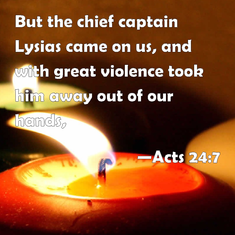 Choose a Background Acts 24:7 But the chief captain Lysias came on us, and with great violence took him away out of our hands, KJV: But the chief captain Lysias came upon us, and with great violence took him away out of our hands, DRB: But Lysias the tribune coming upon us, with great violence took him away out of our hands; DBT: but Lysias, the chiliarch, coming up, took him away with great force out of our hands, ERV: WBT: But the chief captain Lysias came and with great violence took him out of our hands, WEB: YLT: and Lysias the chief captain having come near, with much violence, out of our hands did take away,Links Acts 24:7 NIV • Acts 24:7 NLT • Acts 24:7 ESV • Acts 24:7 NASB • Acts 24:7 KJV • Acts 24:7 Interlinear • Acts 24:7 Commentaries • Acts 24:7 Parallel Texts • Acts 24:7 Bible Apps • Acts 24:7 Parallel • Bible Hub |