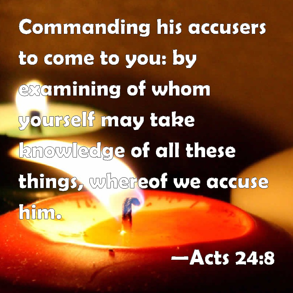 Choose a Background Acts 24:8 Commanding his accusers to come to you: by examining of whom yourself may take knowledge of all these things, whereof we accuse him. KJV: Commanding his accusers to come unto thee: by examining of whom thyself mayest take knowledge of all these things, whereof we accuse him. DRB: Commanding his accusers to come to thee: of whom thou mayest thyself, by examination, have knowledge of all these things, whereof we accuse him. DBT: having commanded his accusers to come to thee; of whom thou canst thyself, in examining him, know the certainty of all these things of which we accuse him. ERV: from whom thou wilt be able, by examining him thyself, to take knowledge of all these things, whereof we accuse him. WBT: Commanding his accusers to come to thee: by examining whom, thou thyself mayest take knowledge of all these things of which we accuse him. WEB: By examining him yourself you may ascertain all these things of which we accuse him." YLT: having commanded his accusers to come to thee, from whom thou mayest be able, thyself having examined, to know concerning all these things of which we accuse him;'Links Acts 24:8 NIV • Acts 24:8 NLT • Acts 24:8 ESV • Acts 24:8 NASB • Acts 24:8 KJV • Acts 24:8 Interlinear • Acts 24:8 Commentaries • Acts 24:8 Parallel Texts • Acts 24:8 Bible Apps • Acts 24:8 Parallel • Bible Hub |