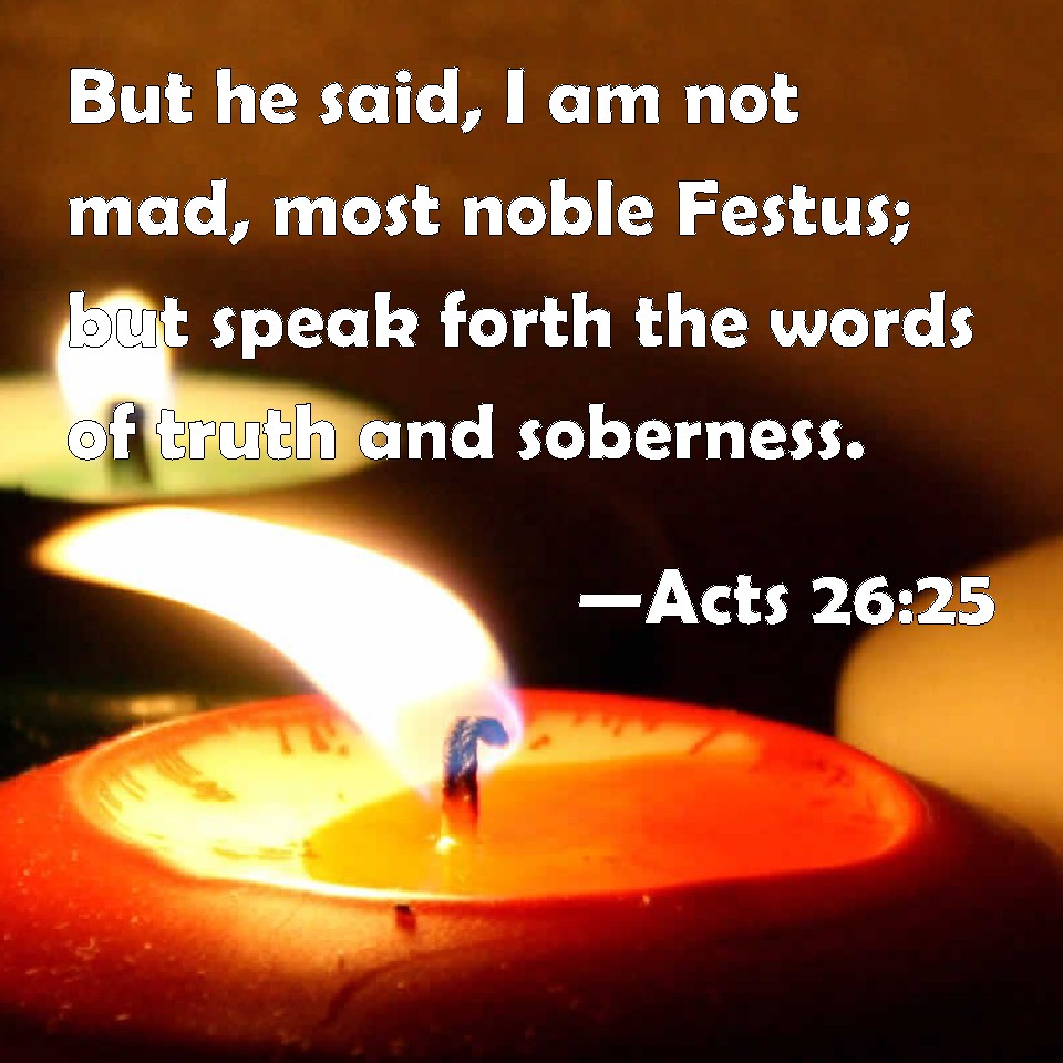 Choose a Background Acts 26:25 But he said, I am not mad, most noble Festus; but speak forth the words of truth and soberness. KJV: But he said, I am not mad, most noble Festus; but speak forth the words of truth and soberness. DRB: And Paul said: I am not mad, most excellent Festus, but I speak words of truth and soberness. DBT: But Paul said, I am not mad, most excellent Festus, but utter words of truth and soberness; ERV: But Paul saith, I am not mad, most excellent Festus; but speak forth words of truth and soberness. WBT: But he said, I am not insane, most noble Festus; but speak forth the words of truth and soberness. WEB: But he said, "I am not crazy, most excellent Festus, but boldly declare words of truth and reasonableness. YLT: and he saith, 'I am not mad, most noble Festus, but of truth and soberness the sayings I speak forth;Links Acts 26:25 NIV • Acts 26:25 NLT • Acts 26:25 ESV • Acts 26:25 NASB • Acts 26:25 KJV • Acts 26:25 Interlinear • Acts 26:25 Commentaries • Acts 26:25 Parallel Texts • Acts 26:25 Bible Apps • Acts 26:25 Parallel • Bible Hub |