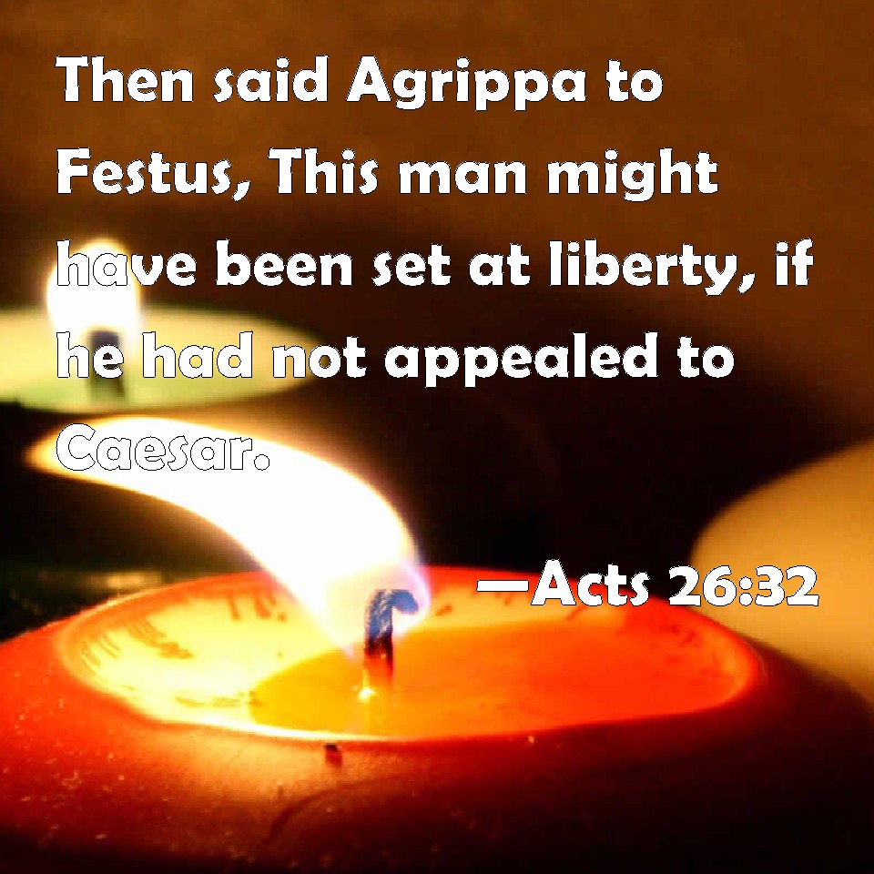 Choose a Background Acts 26:32 Then said Agrippa to Festus, This man might have been set at liberty, if he had not appealed to Caesar. KJV: Then said Agrippa unto Festus, This man might have been set at liberty, if he had not appealed unto Caesar. DRB: And Agrippa said to Festus: This man might have been set at liberty, if he had not appealed to Caesar. DBT: And Agrippa said to Festus, This man might have been let go if he had not appealed to Caesar. ERV: And Agrippa said unto Festus, This man might have been set at liberty, if he had not appealed unto Caesar. WBT: Then said Agrippa to Festus, This man might have been set at liberty, if he had not appealed to Cesar. WEB: Agrippa said to Festus, "This man might have been set free if he had not appealed to Caesar." YLT: and Agrippa said to Festus, 'This man might have been released if he had not appealed to Caesar.'Links Acts 26:32 NIV • Acts 26:32 NLT • Acts 26:32 ESV • Acts 26:32 NASB • Acts 26:32 KJV • Acts 26:32 Interlinear • Acts 26:32 Commentaries • Acts 26:32 Parallel Texts • Acts 26:32 Bible Apps • Acts 26:32 Parallel • Bible Hub |
