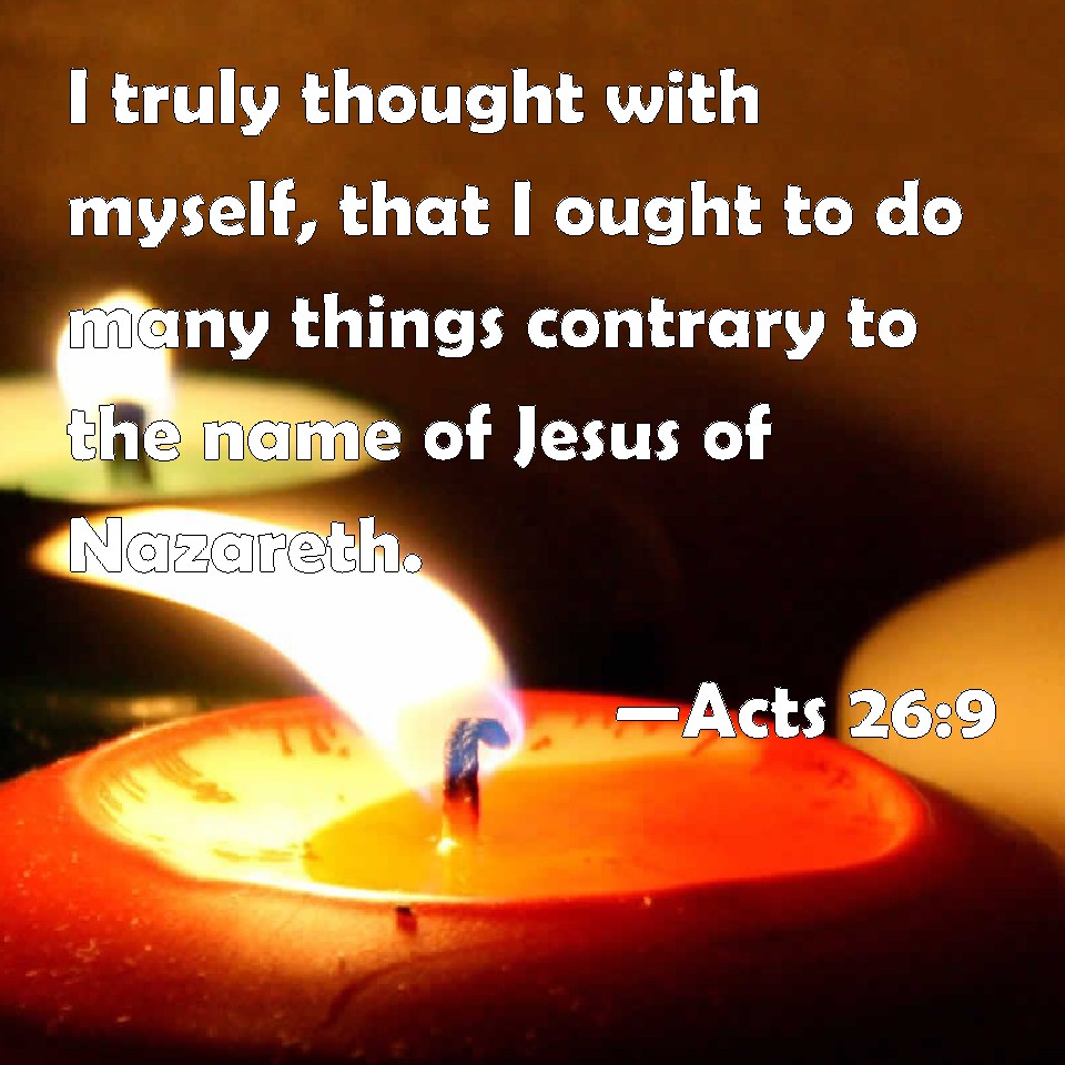 Choose a Background Acts 26:9 I truly thought with myself, that I ought to do many things contrary to the name of Jesus of Nazareth. KJV: I verily thought with myself, that I ought to do many things contrary to the name of Jesus of Nazareth. DRB: And I indeed did formerly think, that I ought to do many things contrary to the name of Jesus of Nazareth. DBT: I indeed myself thought that I ought to do much against the name of Jesus the Nazaraean. ERV: I verily thought with myself, that I ought to do many things contrary to the name of Jesus of Nazareth. WBT: I verily thought with myself, that I ought to do many things contrary to the name of Jesus of Nazareth. WEB: "I myself most certainly thought that I ought to do many things contrary to the name of Jesus of Nazareth. YLT: I, indeed, therefore, thought with myself, that against the name of Jesus of Nazareth it behoved me many things to do,Links Acts 26:9 NIV • Acts 26:9 NLT • Acts 26:9 ESV • Acts 26:9 NASB • Acts 26:9 KJV • Acts 26:9 Interlinear • Acts 26:9 Commentaries • Acts 26:9 Parallel Texts • Acts 26:9 Bible Apps • Acts 26:9 Parallel • Bible Hub |