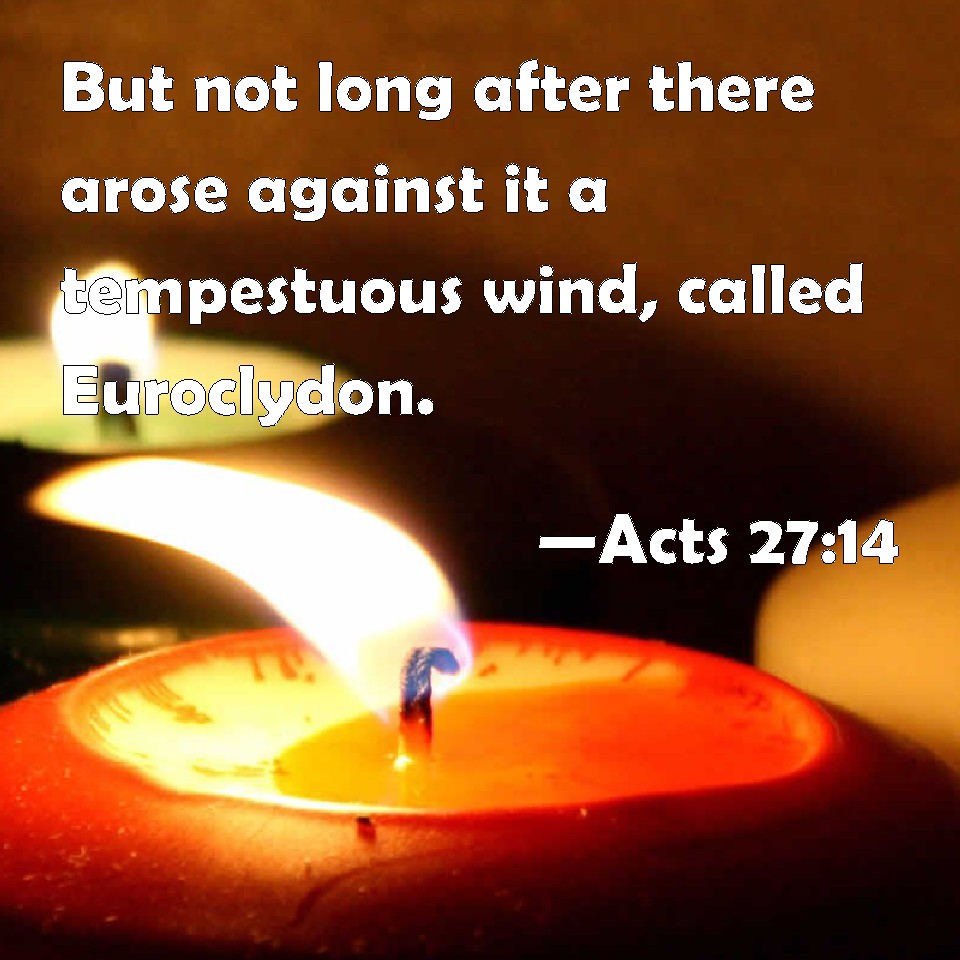 Choose a Background Acts 27:14 But not long after there arose against it a tempestuous wind, called Euroclydon. KJV: But not long after there arose against it a tempestuous wind, called Euroclydon. DRB: But not long after, there arose against it a tempestuous wind, called Euroaquilo. DBT: But not long after there came down it a hurricane called Euroclydon. ERV: But after no long time there beat down from it a tempestuous wind, which is called Euraquilo: WBT: But not long after there arose against it a tempestuous wind, called Euroclydon. WEB: But before long, a stormy wind beat down from shore, which is called Euroclydon. YLT: and not long after there arose against it a tempestuous wind, that is called Euroclydon,Links Acts 27:14 NIV • Acts 27:14 NLT • Acts 27:14 ESV • Acts 27:14 NASB • Acts 27:14 KJV • Acts 27:14 Interlinear • Acts 27:14 Commentaries • Acts 27:14 Parallel Texts • Acts 27:14 Bible Apps • Acts 27:14 Parallel • Bible Hub |