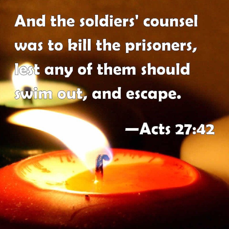 Choose a Background Acts 27:42 And the soldiers' counsel was to kill the prisoners, lest any of them should swim out, and escape. KJV: And the soldiers' counsel was to kill the prisoners, lest any of them should swim out, and escape. DRB: And the soldiers' counsel was, that they should kill the prisoners, lest any of them, swimming out, should escape. DBT: And the counsel of the soldiers was that they should kill the prisoners, lest any one should swim off and escape. ERV: And the soldiers' counsel was to kill the prisoners, lest any of them should swim out, and escape. WBT: And the soldiers' counsel was to kill the prisoners, lest any of them should swim out, and escape. WEB: The soldiers' counsel was to kill the prisoners, so that none of them would swim out and escape. YLT: And the soldiers' counsel was that they should kill the prisoners, lest any one having swam out should escape,Links Acts 27:42 NIV • Acts 27:42 NLT • Acts 27:42 ESV • Acts 27:42 NASB • Acts 27:42 KJV • Acts 27:42 Interlinear • Acts 27:42 Commentaries • Acts 27:42 Parallel Texts • Acts 27:42 Bible Apps • Acts 27:42 Parallel • Bible Hub |