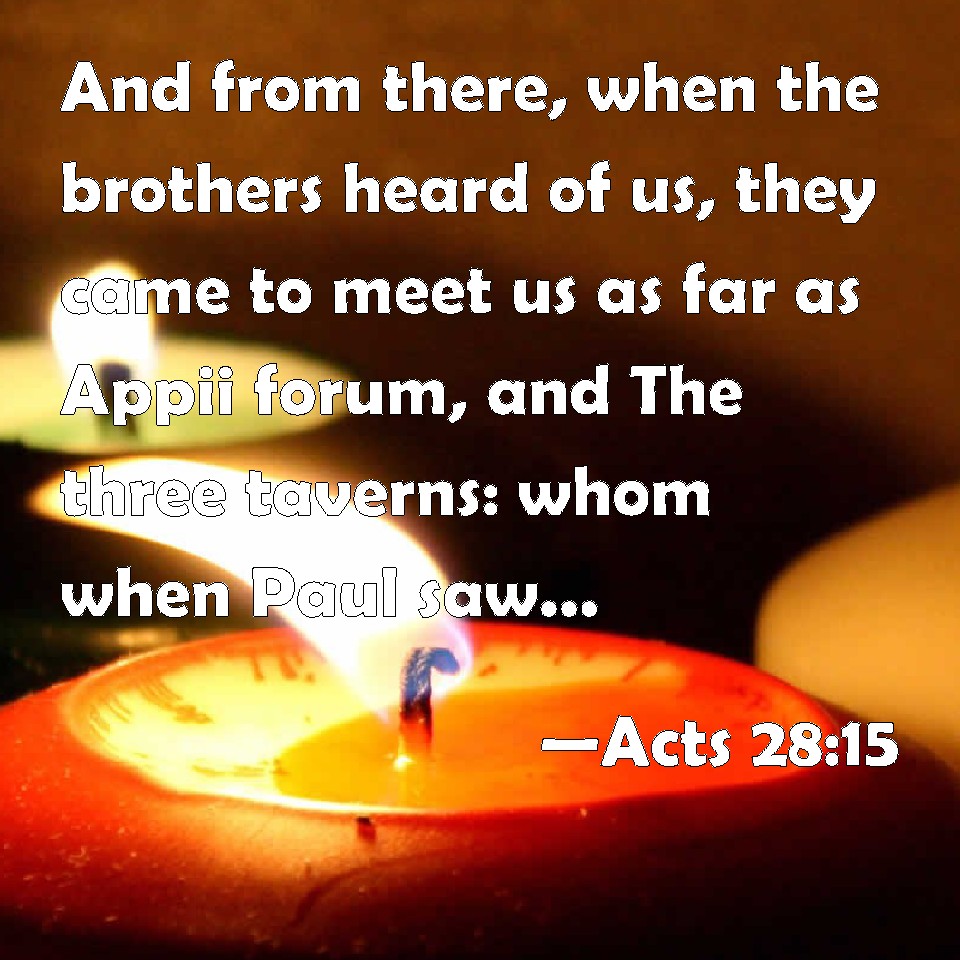 Choose a Background Acts 28:15 And from there, when the brothers heard of us, they came to meet us as far as Appii forum, and The three taverns: whom when Paul saw, he thanked God, and took courage. KJV: And from thence, when the brethren heard of us, they came to meet us as far as Appii forum, and The three taverns: whom when Paul saw, he thanked God, and took courage. DRB: And from thence, when the brethren had heard of us, they came to meet us as far as Appii Forum, and the Three Taverns: whom when Paul saw, he gave thanks to God, and took courage. DBT: And thence the brethren, having heard about us, came to meet us as far as Appii Forum and Tres Tabernae, whom when Paul saw, he thanked God and took courage. ERV: And from thence the brethren, when they heard of us, came to meet us as far as The Market of Appius, and The Three Taverns: whom when Paul saw, he thanked God, and took courage. WBT: And from thence when the brethren heard of us, they came to meet us as far as Appii-forum, and the Three taverns: whom when Paul saw, he thanked God, and took courage. WEB: From there the brothers, when they heard of us, came to meet us as far as The Market of Appius and The Three Taverns. When Paul saw them, he thanked God, and took courage. YLT: and thence, the brethren having heard the things concerning us, came forth to meet us, unto Appii Forum, and Three Taverns — whom Paul having seen, having given thanks to God, took courage.Links Acts 28:15 NIV • Acts 28:15 NLT • Acts 28:15 ESV • Acts 28:15 NASB • Acts 28:15 KJV • Acts 28:15 Interlinear • Acts 28:15 Commentaries • Acts 28:15 Parallel Texts • Acts 28:15 Bible Apps • Acts 28:15 Parallel • Bible Hub |