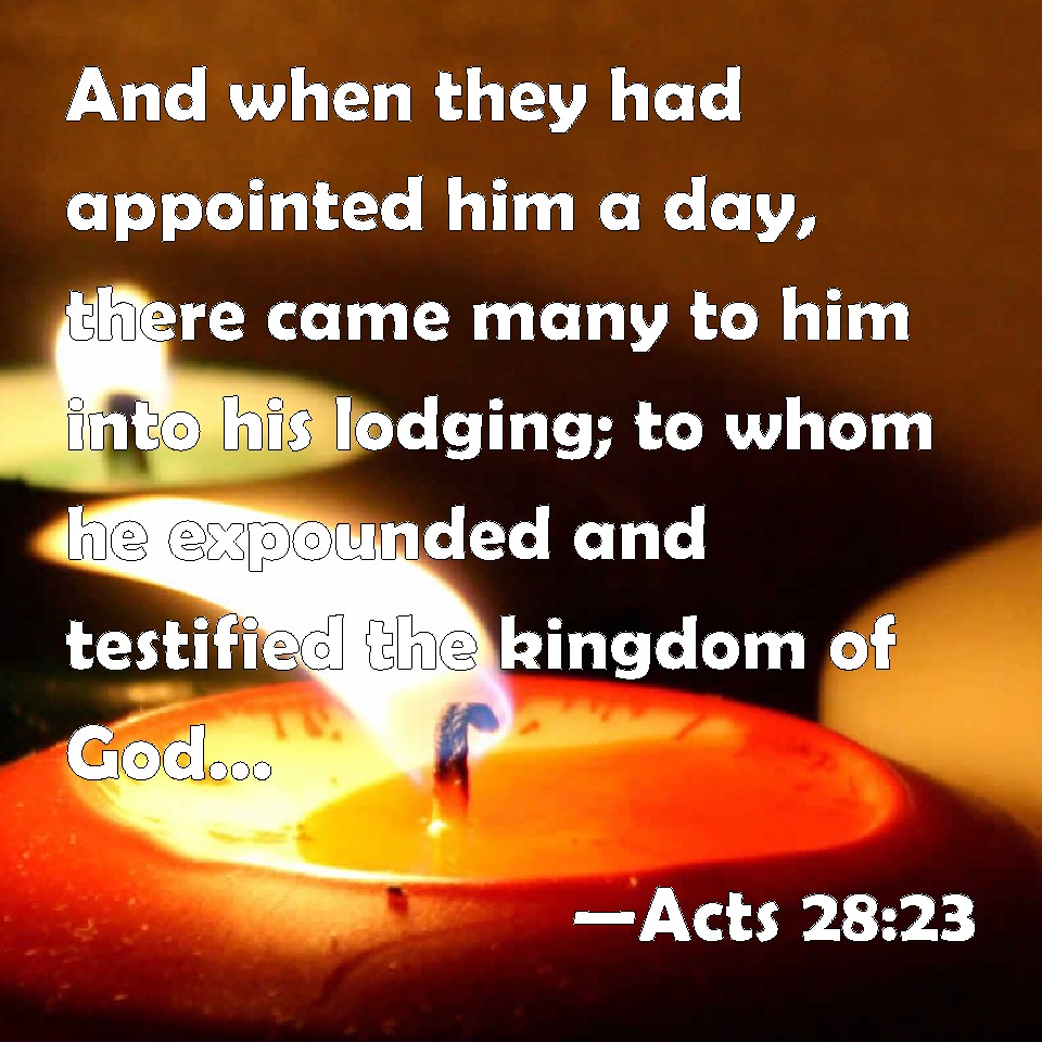 Choose a Background Acts 28:23 And when they had appointed him a day, there came many to him into his lodging; to whom he expounded and testified the kingdom of God, persuading them concerning Jesus, both out of the law of Moses, and out of the prophets, from morning till evening. KJV: And when they had appointed him a day, there came many to him into his lodging; to whom he expounded and testified the kingdom of God, persuading them concerning Jesus, both out of the law of Moses, and out of the prophets, from morning till evening. DRB: And when they had appointed him a day, there came very many to him unto his lodgings; to whom he expounded, testifying the kingdom of God, and persuading them concerning Jesus, out of the law of Moses and the prophets, from morning until evening. DBT: And having appointed him a day many came to him to the lodging, to whom he expounded, testifying of the kingdom of God, and persuading them concerning Jesus, both from the law of Moses and the prophets, from early morning to evening. ERV: And when they had appointed him a day, they came to him into his lodging in great number; to whom he expounded the matter, testifying the kingdom of God, and persuading them concerning Jesus, both from the law of Moses and from the prophets, from morning till evening. WBT: And when they had appointed him a day, there came many to him into his lodging; to whom he expounded and testified the kingdom of God, persuading them concerning Jesus, both out of the law of Moses, and out of the prophets, from morning till evening. WEB: When they had appointed him a day, many people came to him at his lodging. He explained to them, testifying about the Kingdom of God, and persuading them concerning Jesus, both from the law of Moses and from the prophets, from morning until evening. YLT: and having appointed him a day, they came, more of them unto him, to the lodging, to whom he was expounding, testifying fully the reign of God, persuading them also of the things concerning Jesus, both from the law of Moses, and the prophets, from morning till evening,Links Acts 28:23 NIV • Acts 28:23 NLT • Acts 28:23 ESV • Acts 28:23 NASB • Acts 28:23 KJV • Acts 28:23 Interlinear • Acts 28:23 Commentaries • Acts 28:23 Parallel Texts • Acts 28:23 Bible Apps • Acts 28:23 Parallel • Bible Hub |