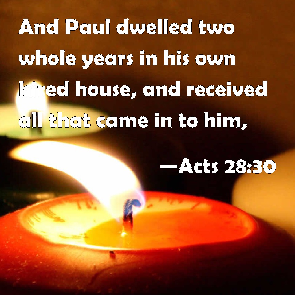 Choose a Background Acts 28:30 And Paul dwelled two whole years in his own hired house, and received all that came in to him, KJV: And Paul dwelt two whole years in his own hired house, and received all that came in unto him, DRB: And he remained two whole years in his own hired lodging; and he received all that came in to him, DBT: And he remained two whole years in his own hired lodging, and received all who came to him, ERV: And he abode two whole years in his own hired dwelling, and received all that went in unto him, WBT: And Paul dwelt two whole years in his own hired house, and received all that came in to him, WEB: Paul stayed two whole years in his own rented house, and received all who were coming to him, YLT: and Paul remained an entire two years in his own hired house, and was receiving all those coming in unto him,Links Acts 28:30 NIV • Acts 28:30 NLT • Acts 28:30 ESV • Acts 28:30 NASB • Acts 28:30 KJV • Acts 28:30 Interlinear • Acts 28:30 Commentaries • Acts 28:30 Parallel Texts • Acts 28:30 Bible Apps • Acts 28:30 Parallel • Bible Hub |