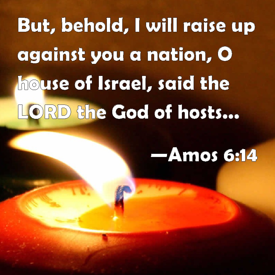 Choose a Background Amos 6:14 But, behold, I will raise up against you a nation, O house of Israel, said the LORD the God of hosts; and they shall afflict you from the entering in of Hemath to the river of the wilderness. KJV: But, behold, I will raise up against you a nation, O house of Israel, saith the LORD the God of hosts; and they shall afflict you from the entering in of Hemath unto the river of the wilderness. DRB: But behold, I will raise up a nation against you, O house of Israel, saith the Lord the God of hosts; and they shall destroy you from the entrance of Emath, even to the torrent of the desert. DBT: For behold, O house of Israel, saith Jehovah the God of hosts, I will raise up against you a nation; and they shall afflict you from the entering in of Hamath unto the torrent of the Arabah. ERV: For, behold, I will raise up against you a nation, O house of Israel, saith the LORD, the God of hosts; and they shall afflict you from the entering in of Hamath unto the brook of the Arabah. WBT: But behold, I will raise up against you a nation, O house of Israel, saith the LORD the God of hosts; and they shall afflict you from the entrance of Hamath to the river of the wilderness. WEB: For, behold, I will raise up against you a nation, house of Israel," says Yahweh, the God of Armies; "and they will afflict you from the entrance of Hamath to the brook of the Arabah." YLT: Surely, lo, I am raising against you a nation, O house of Israel, An affirmation of Jehovah, God of Hosts, And they have oppressed you from the coming in to Hamath, Unto the stream of the desert.Links Amos 6:14 NIV • Amos 6:14 NLT • Amos 6:14 ESV • Amos 6:14 NASB • Amos 6:14 KJV • Amos 6:14 Interlinear • Amos 6:14 Commentaries • Amos 6:14 Parallel Texts • Amos 6:14 Bible Apps • Amos 6:14 Parallel • Bible Hub |