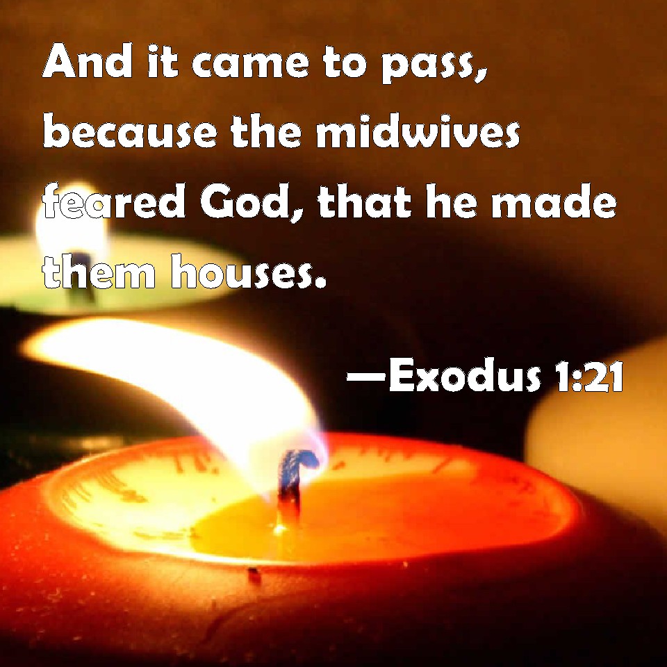 Choose a Background Exodus 1:21 And it came to pass, because the midwives feared God, that he made them houses. KJV: And it came to pass, because the midwives feared God, that he made them houses. DRB: And because the midwives feared God, he built them houses. DBT: And it came to pass, because the midwives feared God, that he made them houses. ERV: And it came to pass, because the midwives feared God, that he made them houses. WBT: And it came to pass, because the midwives feared God, that he made them houses. WEB: It happened, because the midwives feared God, that he gave them families. YLT: and it cometh to pass, because the midwives have feared God, that He maketh for them households;Links Exodus 1:21 NIV • Exodus 1:21 NLT • Exodus 1:21 ESV • Exodus 1:21 NASB • Exodus 1:21 KJV • Exodus 1:21 Interlinear • Exodus 1:21 Commentaries • Exodus 1:21 Parallel Texts • Exodus 1:21 Bible Apps • Exodus 1:21 Parallel • Bible Hub |