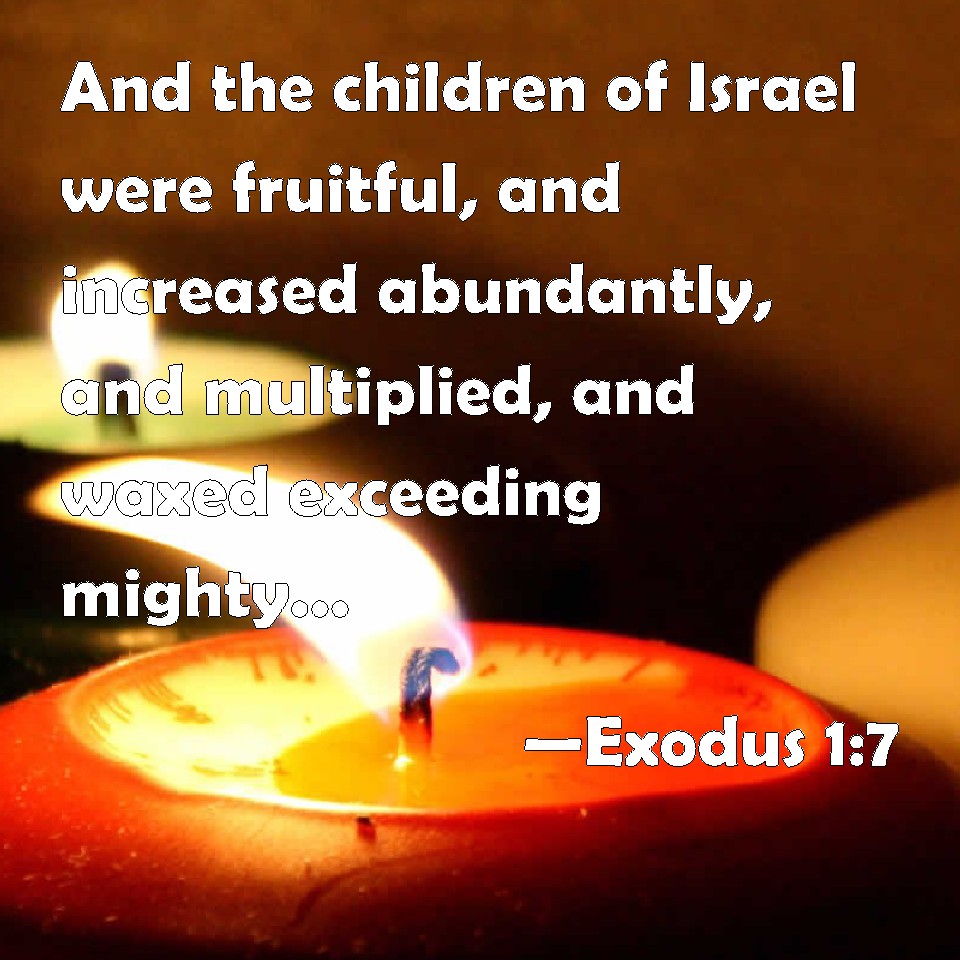 Choose a Background Exodus 1:7 And the children of Israel were fruitful, and increased abundantly, and multiplied, and waxed exceeding mighty; and the land was filled with them. KJV: And the children of Israel were fruitful, and increased abundantly, and multiplied, and waxed exceeding mighty; and the land was filled with them. DRB: The children of Israel increased, and sprung up into multitudes, and growing exceedingly strong they filled the land. DBT: And the children of Israel were fruitful, and swarmed and multiplied, and became exceeding strong; and the land was full of them. ERV: And the children of Israel were fruitful, and increased abundantly, and multiplied, and waxed exceeding mighty; and the land was filled with them. WBT: And the children of Israel were fruitful, and increased abundantly, and multiplied, and became exceeding mighty; and the land was filled with them. WEB: The children of Israel were fruitful, and increased abundantly, and multiplied, and grew exceedingly mighty; and the land was filled with them. YLT: and the sons of Israel have been fruitful, and they teem, and multiply, and are very very mighty, and the land is filled with them.Links Exodus 1:7 NIV • Exodus 1:7 NLT • Exodus 1:7 ESV • Exodus 1:7 NASB • Exodus 1:7 KJV • Exodus 1:7 Interlinear • Exodus 1:7 Commentaries • Exodus 1:7 Parallel Texts • Exodus 1:7 Bible Apps • Exodus 1:7 Parallel • Bible Hub |