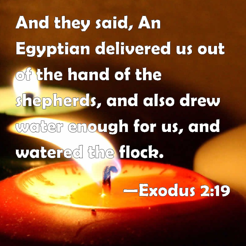 Choose a Background Exodus 2:19 And they said, An Egyptian delivered us out of the hand of the shepherds, and also drew water enough for us, and watered the flock. KJV: And they said, An Egyptian delivered us out of the hand of the shepherds, and also drew water enough for us, and watered the flock. DRB: They answered: A man of Egypt delivered us from the hands of the shepherds: and he drew water also with us, and gave the sheep to drink. DBT: And they said, An Egyptian delivered us out of the hand of the shepherds, and also drew water abundantly for us, and watered the flock. ERV: And they said, An Egyptian delivered us out of the hand of the shepherds, and moreover he drew water for us, and watered the flock. WBT: And they said, An Egyptian delivered us from the hand of the shepherds, and also drew water enough for us, and watered the flock. WEB: They said, "An Egyptian delivered us out of the hand of the shepherds, and moreover he drew water for us, and watered the flock." YLT: and they say, 'A man, an Egyptian, hath delivered us out of the hand of the shepherds, and also hath diligently drawn for us, and watereth the flock;'Links Exodus 2:19 NIV • Exodus 2:19 NLT • Exodus 2:19 ESV • Exodus 2:19 NASB • Exodus 2:19 KJV • Exodus 2:19 Interlinear • Exodus 2:19 Commentaries • Exodus 2:19 Parallel Texts • Exodus 2:19 Bible Apps • Exodus 2:19 Parallel • Bible Hub |