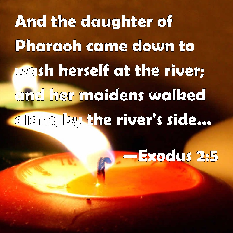 Choose a Background Exodus 2:5 And the daughter of Pharaoh came down to wash herself at the river; and her maidens walked along by the river's side; and when she saw the ark among the flags, she sent her maid to fetch it. KJV: And the daughter of Pharaoh came down to wash herself at the river; and her maidens walked along by the river's side; and when she saw the ark among the flags, she sent her maid to fetch it. DRB: And behold the daughter of Pharao came down to wash herself in the river: and her maids walked by the river's brink. And when she saw the basket in the sedges, she sent one of her maids for it: and when it was brought, DBT: And the daughter of Pharaoh went down to bathe in the river; and her maids went along by the river's side. And she saw the ark in the midst of the sedge, and sent her handmaid and fetched it. ERV: And the daughter of Pharaoh came down to bathe at the river; and her maidens walked along by the river side; and she saw the ark among the flags, and sent her handmaid to fetch it. WBT: And the daughter of Pharaoh came down to wash herself at the river, and her maidens walked along by the river's side: and when she saw the ark among the flags, she sent her maid to fetch it. WEB: Pharaoh's daughter came down to bathe at the river. Her maidens walked along by the riverside. She saw the basket among the reeds, and sent her handmaid to get it. YLT: And a daughter of Pharaoh cometh down to bathe at the River, and her damsels are walking by the side of the River, and she seeth the ark in the midst of the weeds, and sendeth her handmaid, and she taketh it,Links Exodus 2:5 NIV • Exodus 2:5 NLT • Exodus 2:5 ESV • Exodus 2:5 NASB • Exodus 2:5 KJV • Exodus 2:5 Interlinear • Exodus 2:5 Commentaries • Exodus 2:5 Parallel Texts • Exodus 2:5 Bible Apps • Exodus 2:5 Parallel • Bible Hub |