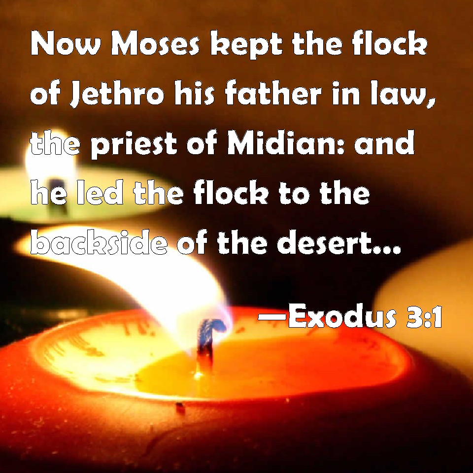 Choose a Background Exodus 3:1 Now Moses kept the flock of Jethro his father in law, the priest of Midian: and he led the flock to the backside of the desert, and came to the mountain of God, even to Horeb. KJV: Now Moses kept the flock of Jethro his father in law, the priest of Midian: and he led the flock to the backside of the desert, and came to the mountain of God, even to Horeb. DRB: Now Moses fed the sheep of Jethro his father in law, the priest of Madian: and he drove the flock to the inner parts of the desert, and came to the mountain of God, Horeb. DBT: And Moses tended the flock of Jethro his father-in-law, the priest of Midian. And he led the flock behind the wilderness, and came to the mountain of God to Horeb. ERV: Now Moses was keeping the flock of Jethro his father in law, the priest of Midian: and he led the flock to the back of the wilderness, and came to the mountain of God, unto Horeb. WBT: Now Moses kept the flock of Jethro his father-in-law, the priest of Midian: and he led the flock to the backside of the desert, and came to the mountain of God, even to Horeb. WEB: Now Moses was keeping the flock of Jethro, his father-in-law, the priest of Midian, and he led the flock to the back of the wilderness, and came to God's mountain, to Horeb. YLT: And Moses hath been feeding the flock of Jethro his father-in-law, priest of Midian, and he leadeth the flock behind the wilderness, and cometh in unto the mount of God, to Horeb;Links Exodus 3:1 NIV • Exodus 3:1 NLT • Exodus 3:1 ESV • Exodus 3:1 NASB • Exodus 3:1 KJV • Exodus 3:1 Interlinear • Exodus 3:1 Commentaries • Exodus 3:1 Parallel Texts • Exodus 3:1 Bible Apps • Exodus 3:1 Parallel • Bible Hub |