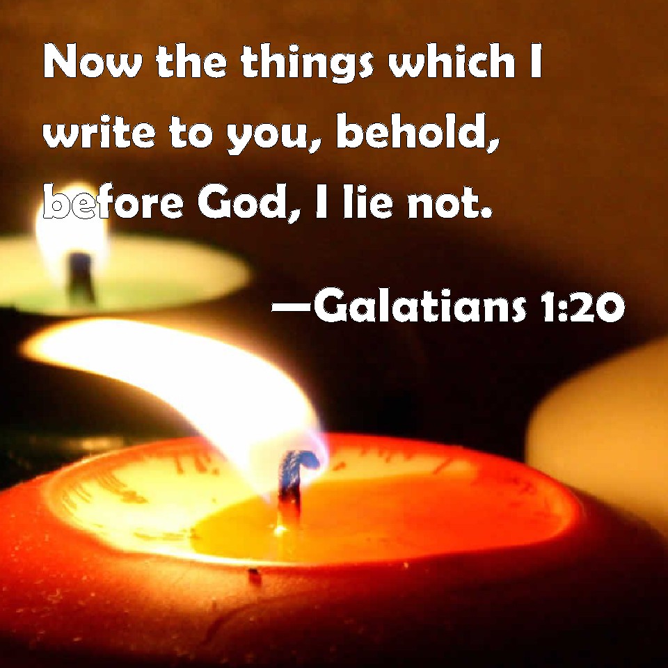 Choose a Background Galatians 1:20 Now the things which I write to you, behold, before God, I lie not. KJV: Now the things which I write unto you, behold, before God, I lie not. DRB: Now the things which I write to you, behold, before God, I lie not. DBT: Now what I write to you, behold, before God, I do not lie. ERV: Now touching the things which I write unto you, behold, before God, I lie not. WBT: Now the things which I write to you, behold, before God, I lie not. WEB: Now about the things which I write to you, behold, before God, I'm not lying. YLT: And the things that I write to you, lo, before God — I lie not;Links Galatians 1:20 NIV • Galatians 1:20 NLT • Galatians 1:20 ESV • Galatians 1:20 NASB • Galatians 1:20 KJV • Galatians 1:20 Interlinear • Galatians 1:20 Commentaries • Galatians 1:20 Parallel Texts • Galatians 1:20 Bible Apps • Galatians 1:20 Parallel • Bible Hub |